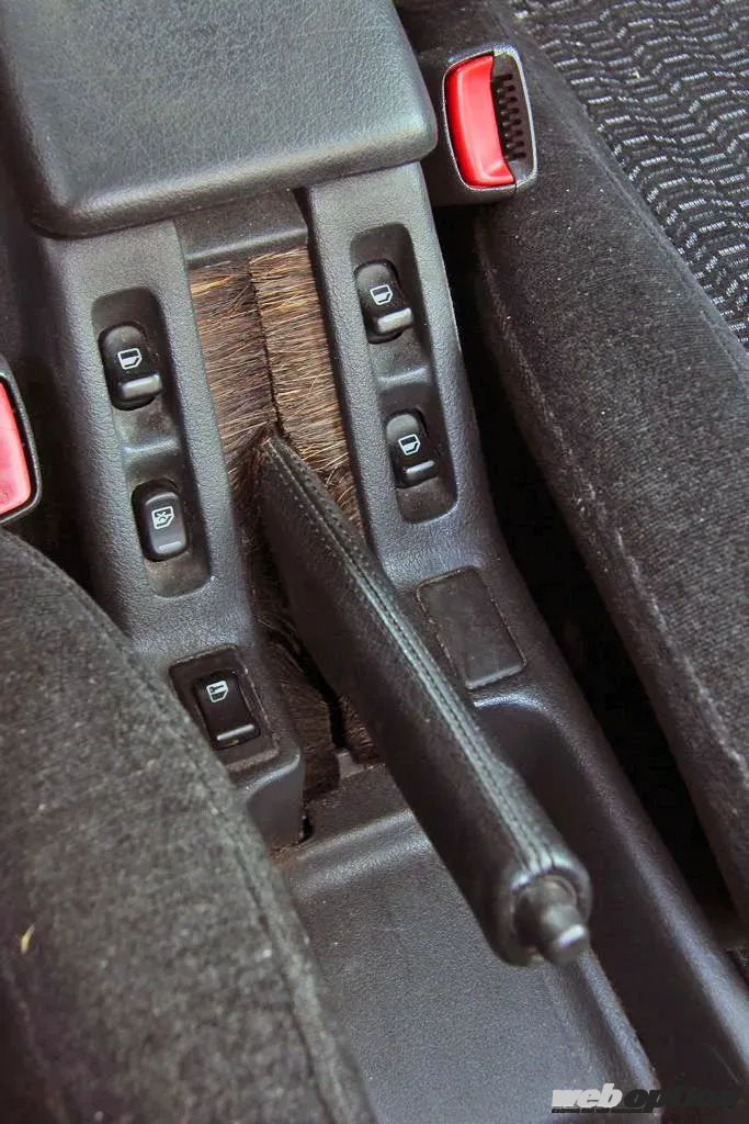P10プリメーラシリーズ全体を通して、前期型はパワーウインドウの集中スイッチがサイドブレーキ脇に設けられるなど、この辺りも欧州車的。サイドブレーキの付け根が向かい合ったハブラシのようになっているのは2.0eGTのみだ。
