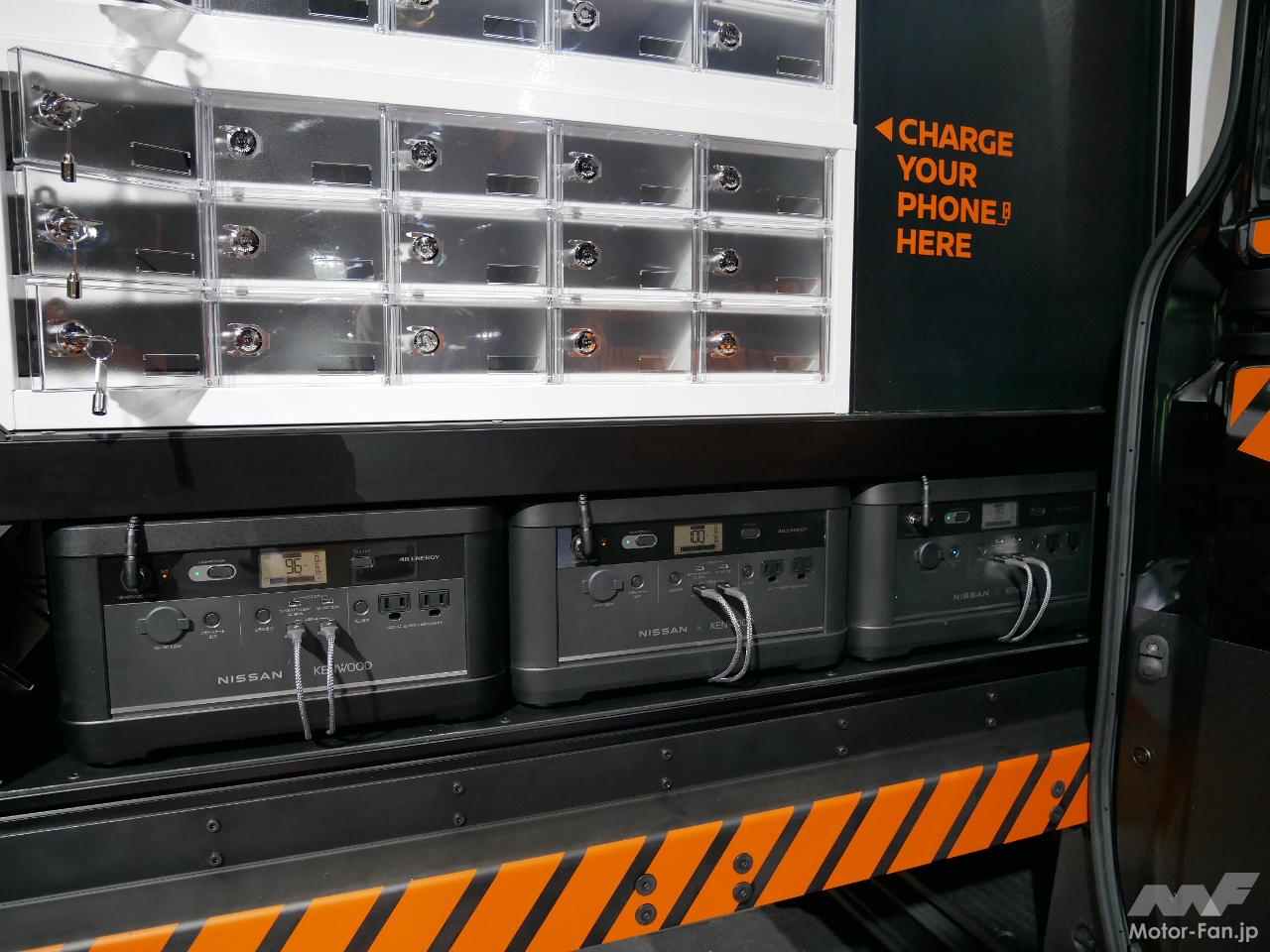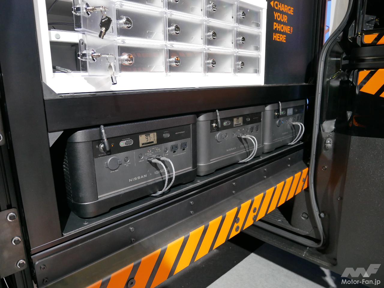 具体的には、100名程度の小規模な自治体をイメージしているということで、住民のスマートフォンを充電したり、職員のノートパソコンを稼働させたりする電源として活用、2〜3日は拠点として活動できることを目指している。そのための電源として、日産のEV「リーフ」から取り出したバッテリーをリサイクルしたポータブルバッテリーを17機搭載しているのも日産らしいところだ。
