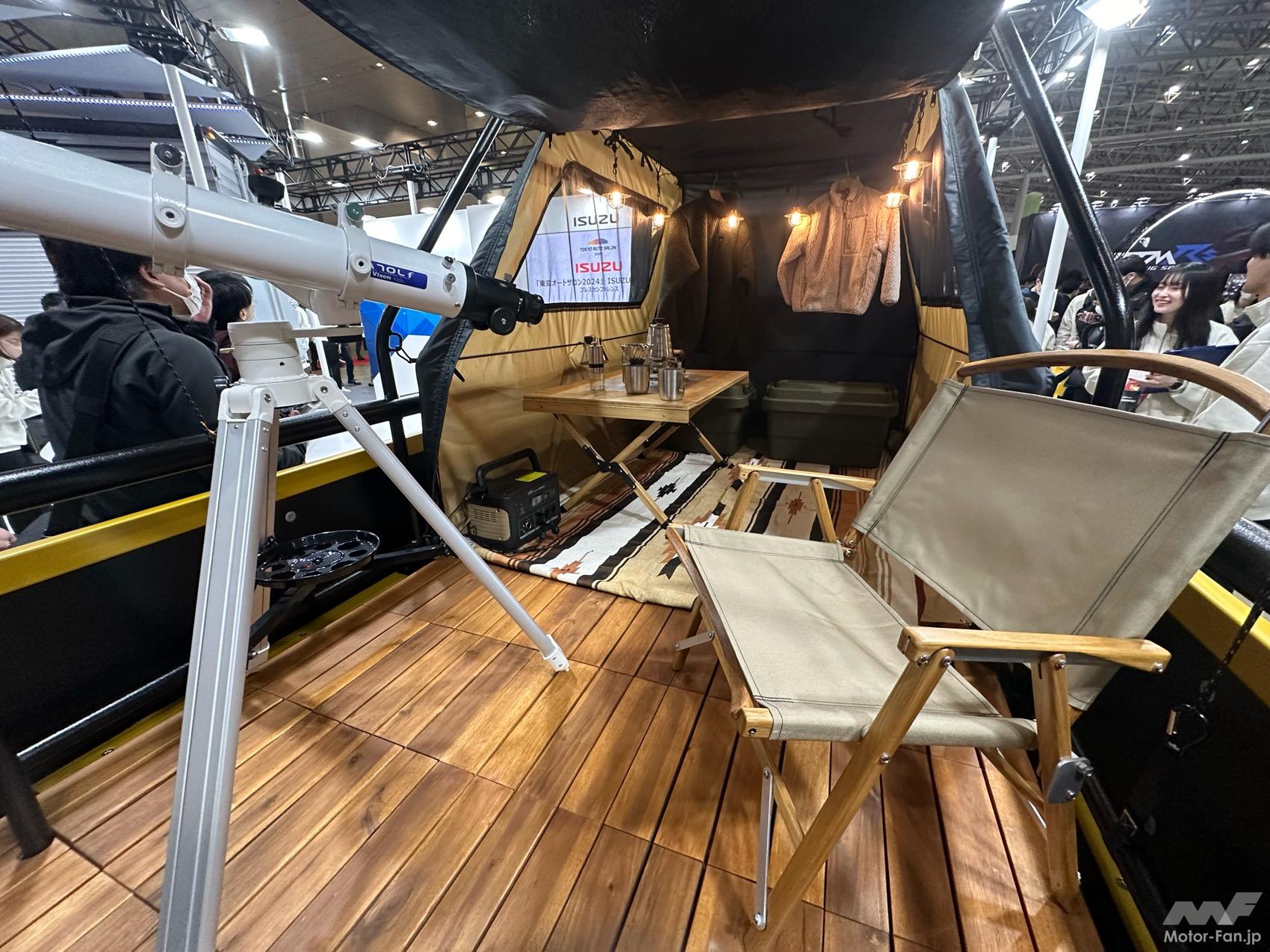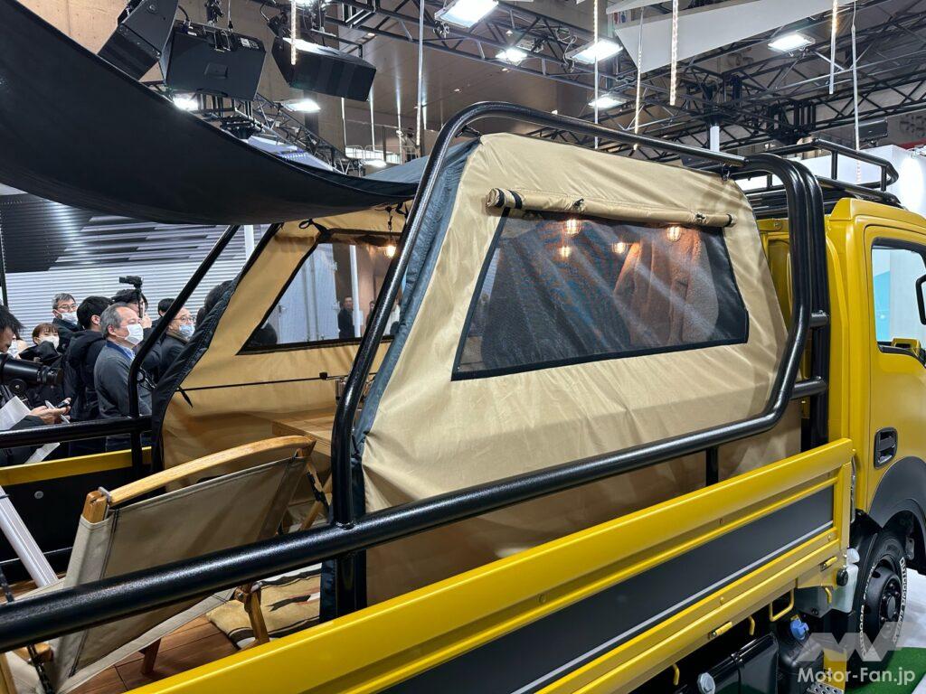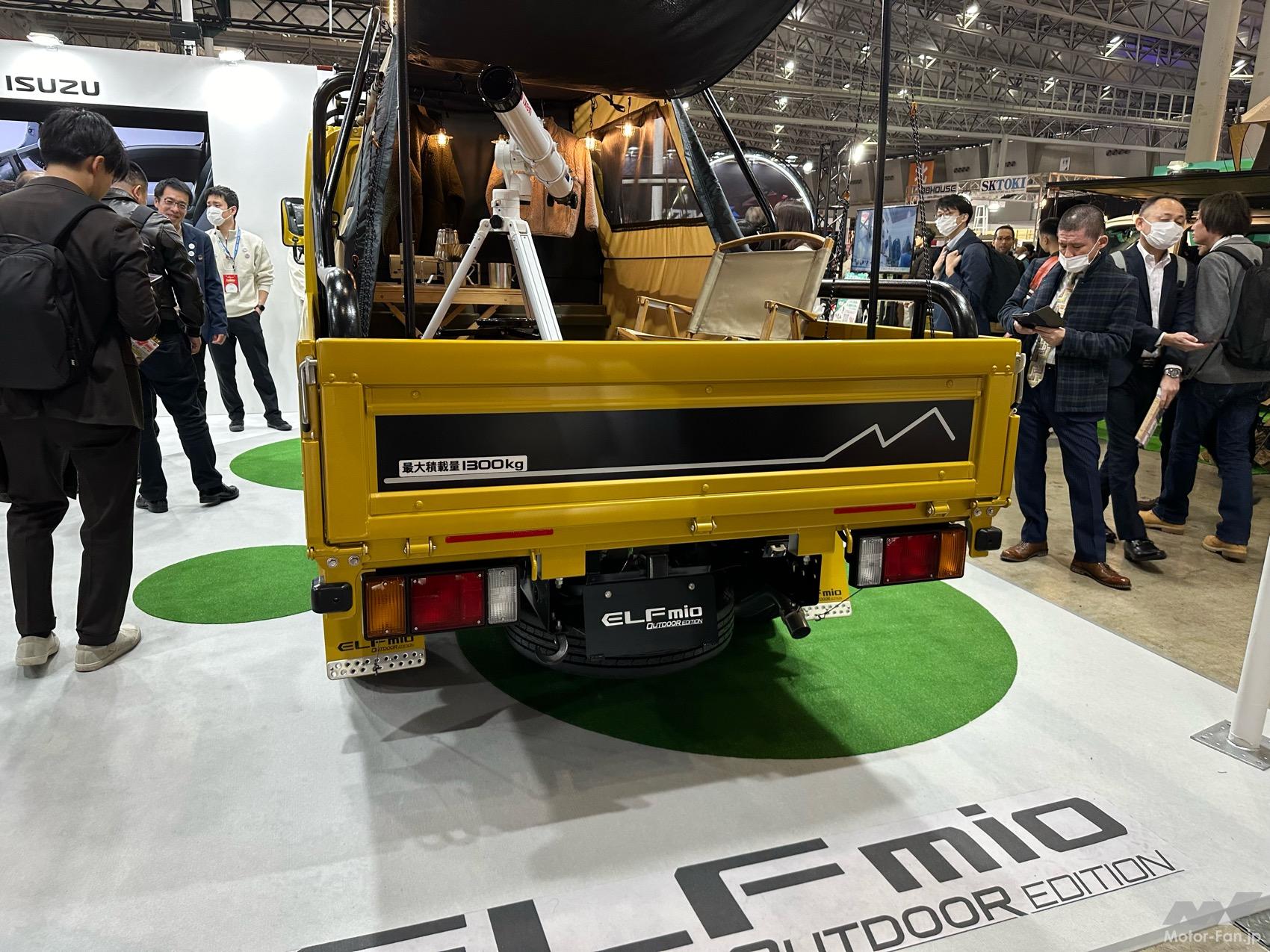 もう1台は「遊ぶ」をテーマにした、『エルフミオ・アウトドアエディション』だ。普通自動車免許で運転できるエルフミオに、昨今軽トラで流行しているオフロードカスタムの手法をプラス。運転席上のラック&ライトバー、荷台のケージ、そしてそれに装着できるテントなどが特徴のカスタムカーだ。仕事車とアソビ車を両立できる同車は、まさに小型トラックの新しい方向性を感じさせる1台となっている。
