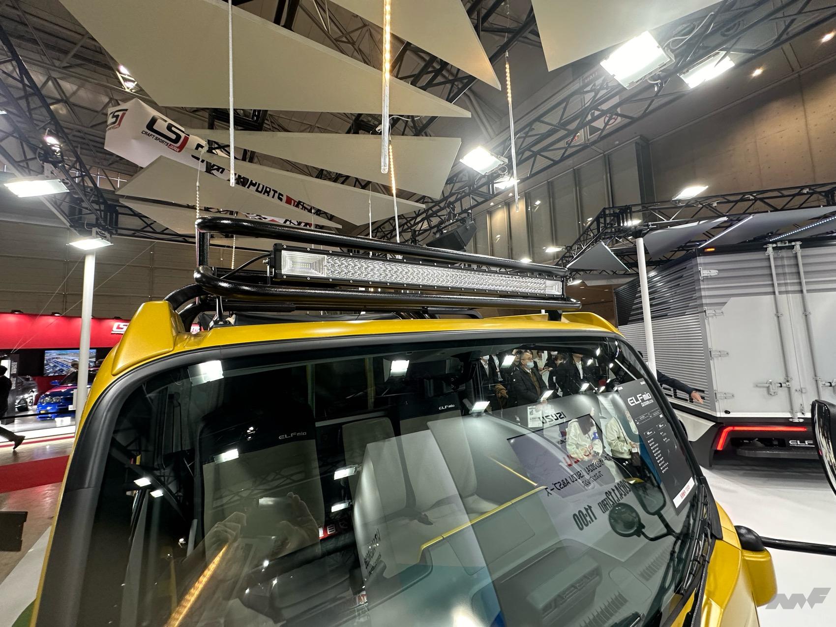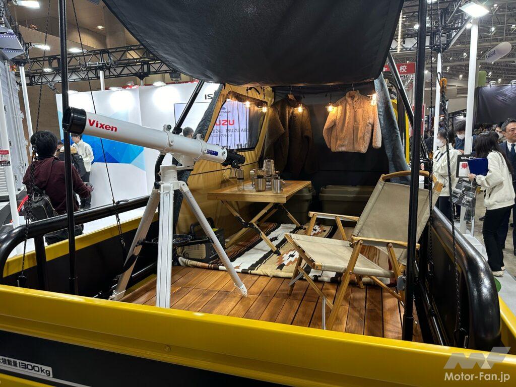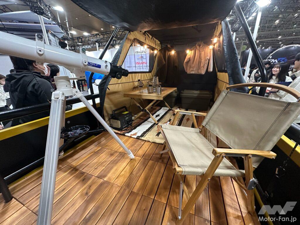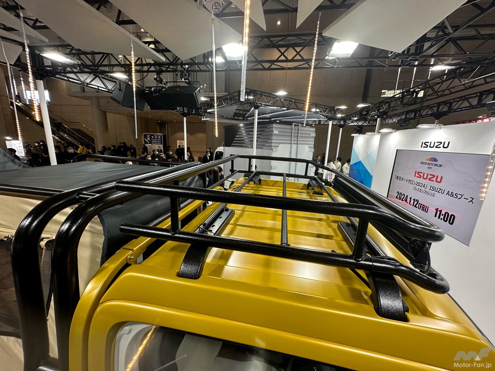 もう1台は「遊ぶ」をテーマにした、『エルフミオ・アウトドアエディション』だ。普通自動車免許で運転できるエルフミオに、昨今軽トラで流行しているオフロードカスタムの手法をプラス。運転席上のラック&ライトバー、荷台のケージ、そしてそれに装着できるテントなどが特徴のカスタムカーだ。仕事車とアソビ車を両立できる同車は、まさに小型トラックの新しい方向性を感じさせる1台となっている。