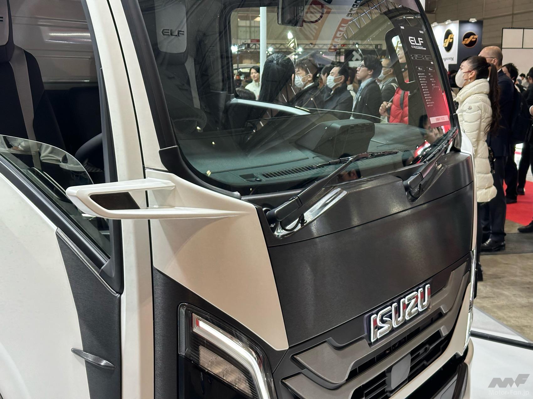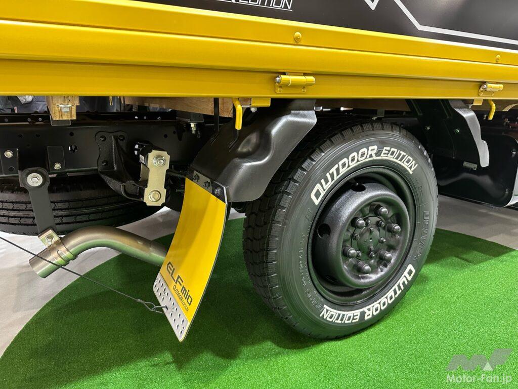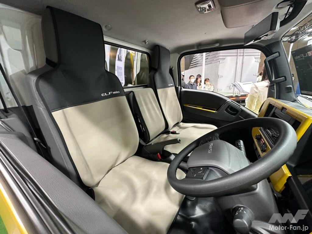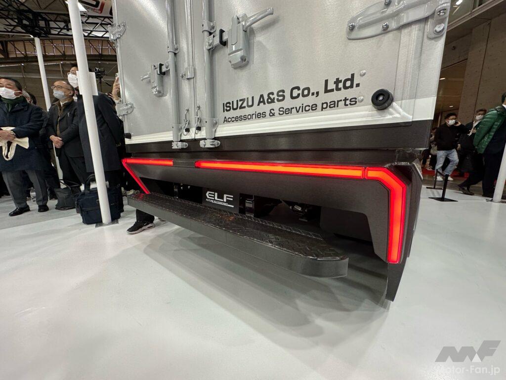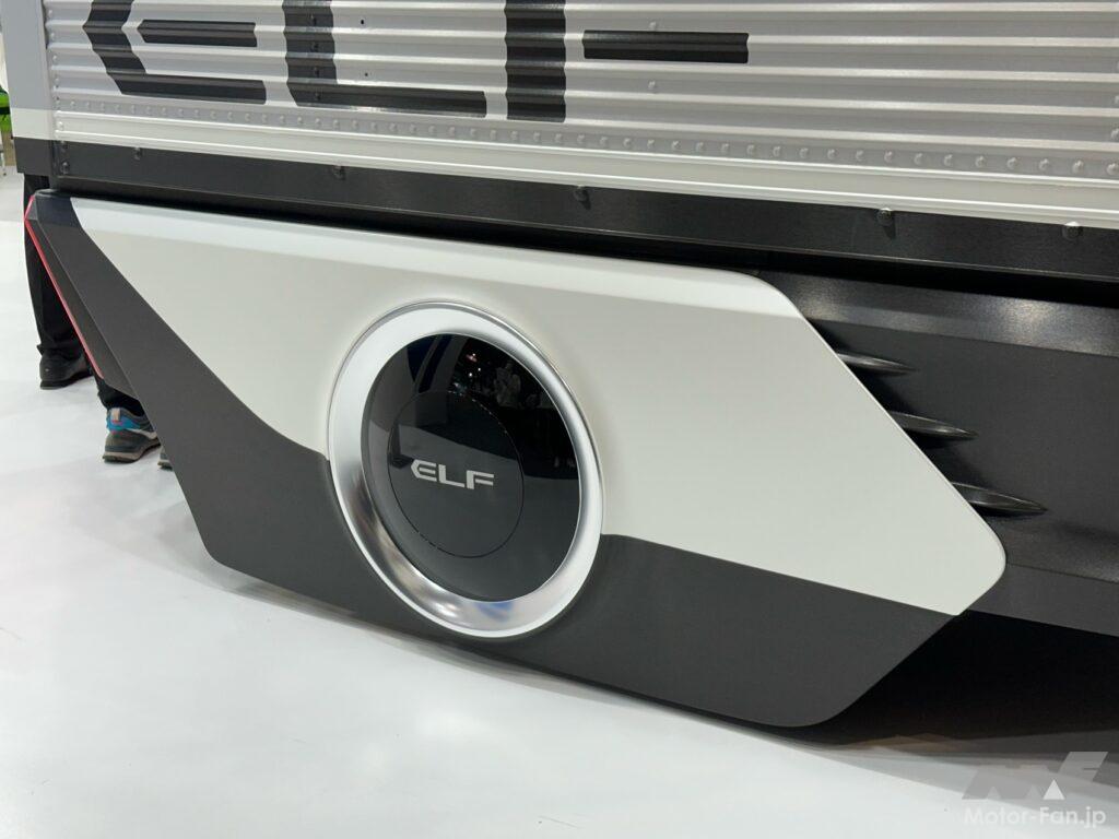 特筆すべきは後輪付近のサイドカバーで、ホイールを模したダミーホイールカバーを実際の車軸よりも後方に付けることで、安定感のあるフォルムを実現している。また、後部にはトレンドとなっているライン状のLEDストップランプを配して、エルフの未来形をさらにグレードアップさせた。