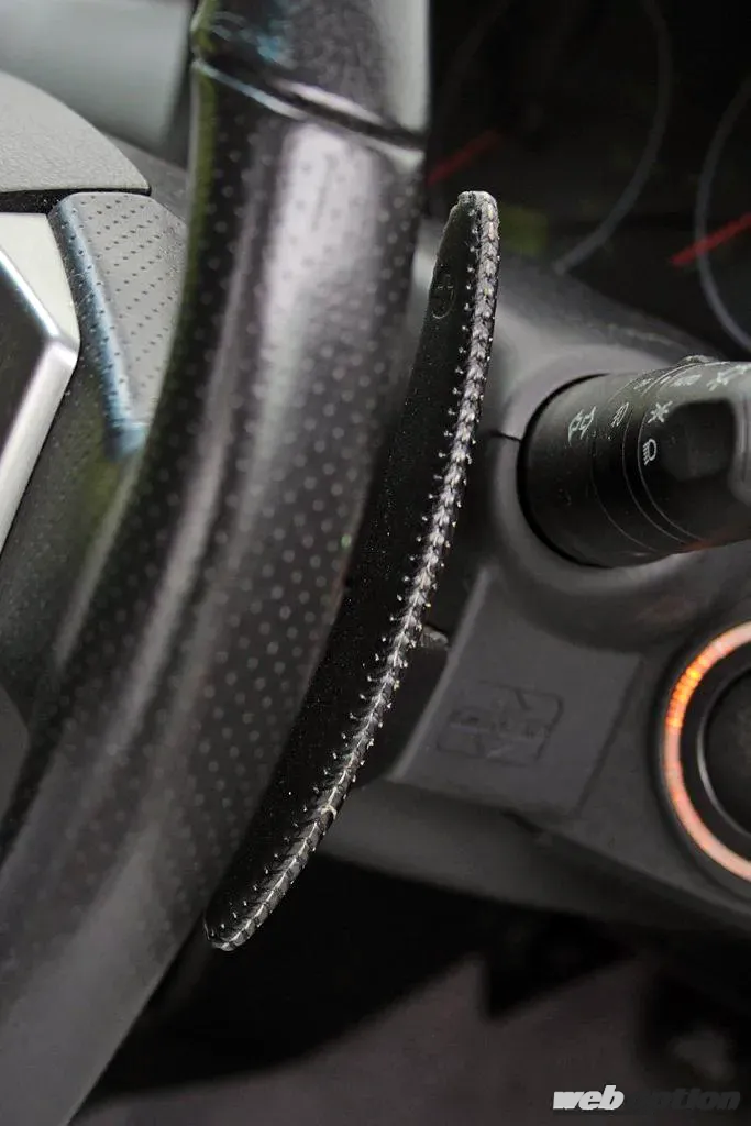 シフトアップ/ダウンはレバー前後操作の他、ステアリングコラム両側に設けられた本革巻きのパドルシフトでも可能。右側でシフトアップ、左側でシフトダウンとなる。適度なストローク量と確かなクリック感によって、リズミカルにパドル操作ができる。