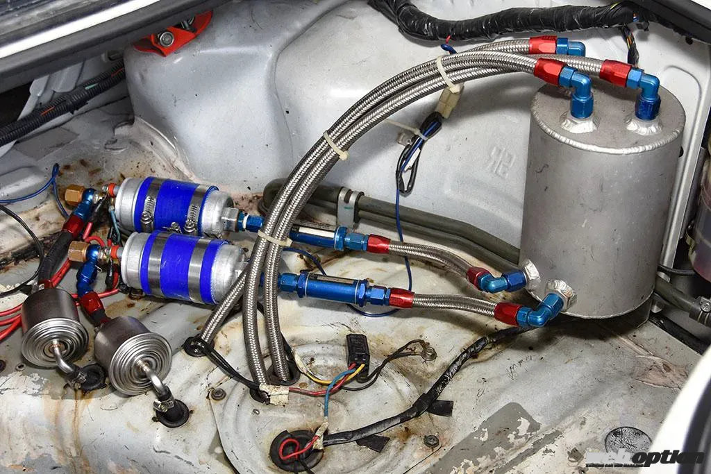 トランクルームは内装パーツを全て撤去した上で、295L/hのフューエルポンプ2機と燃料の偏りを防止するコレクタータンクを設置する。