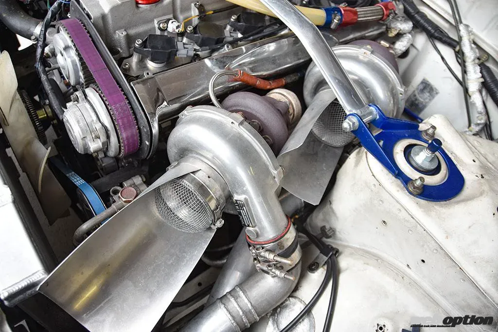 エンジン本体はHKSの87φピストンやコンロッド、クランクシャフトで強化。そこにIHIのRX6 TCW77タービンを2機セットして1084ps/89.9kgmというスペックを誇る。