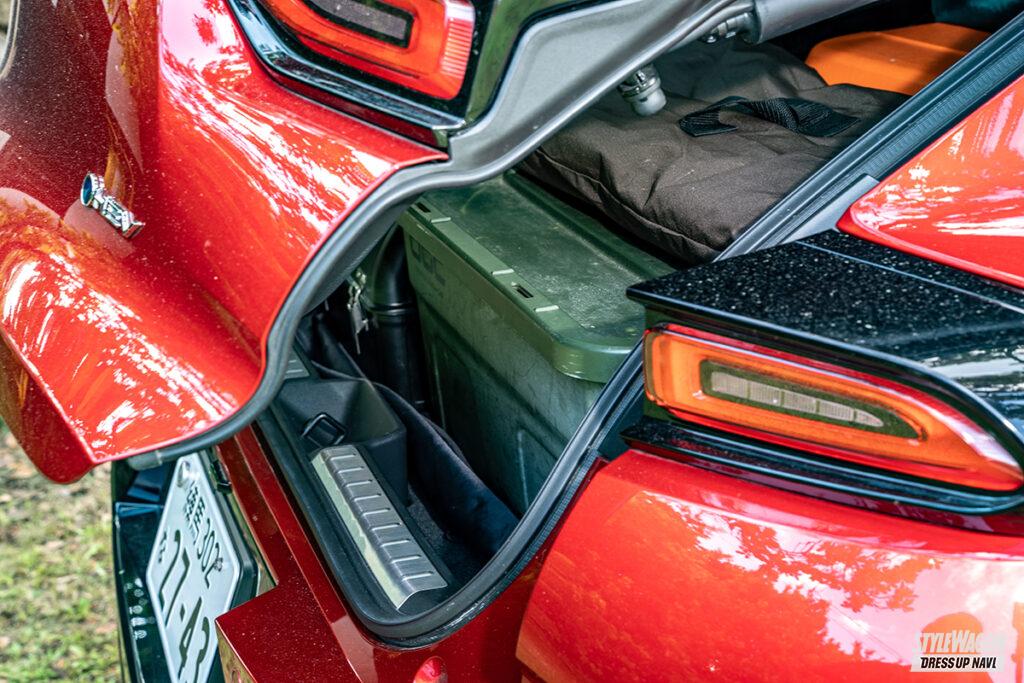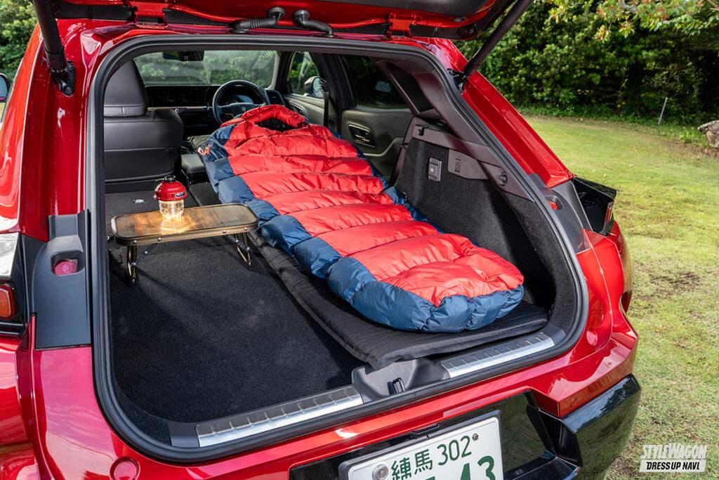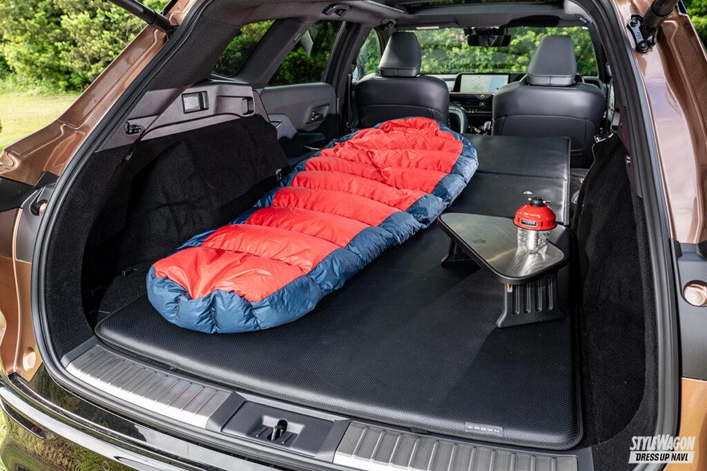 まず想像以上に驚きの連続だったのがエステート。ミニバンやSUVなど様々なジャンルに分けられるクルマのなかで、最も快適に車中泊できるクルマだと個人的に思っているのがステーションワゴン。広いラゲッジスペースを備え、後席を前に倒すことで就寝スペースを確保するスタイルは、身長170cm程度の大人が足を屈めることなく寝転ぶことができるパターンが多い。エステートも同様のかたちで就寝スペースをつくれるが、車中泊や外出先での快適性を高める装備や機能がとにかく満載。後席を倒すとラゲッジとフラットなスペースが広がるだけでなく、後席の背面部分の長さを延長する「ラゲージルーム拡張ボード」を装備することで、長さ約2mの完全フラットスペースが完成する。しかも寝転ぶ場所がシート背面なのに、肌触りの良い素材を採用しているので、このまま寝られそうなほどの心地良さ。とはいえ一晩を過ごすには少々硬いと気になったが、エステート専用のフルフラットラゲージマットがオプションで用意! さらにラゲッジ側面にはテーブルに変形するデッキサイドカバーが装備されているなど車中泊派にとっては至れり尽くせり。車中泊した翌朝の疲れなんてまったくなく、格安ビジネスホテルのベッドよりも快適かも!? と思うほどぐっすり眠れた。