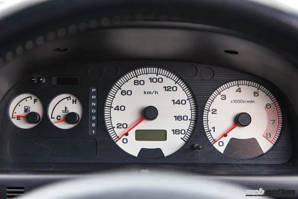 メーターの文字盤はオフホワイト。スピードメーターを中心に、右側にタコメーター、左側に水温計と燃料計が配置される。