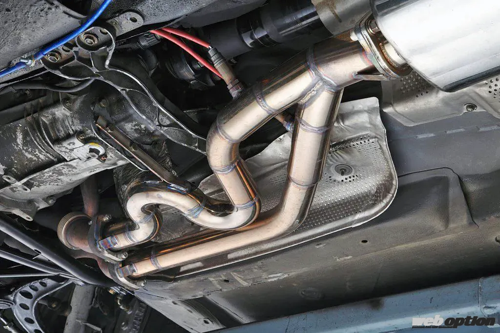 また、それにはEXマニ以降フルに見直された排気系も大きく貢献している。排気系は3→1とされたEXマニ直後のフロントパイプからワンオフ製作。2→1集合部までの長さは、理想とされるEXマニ長の2倍に設定される。さらに、集合部までの長さを合わせるために4〜6番シリンダー側のフロントパイプは大きくうねらせられる。パイプ径は54φ×2→70φだ。