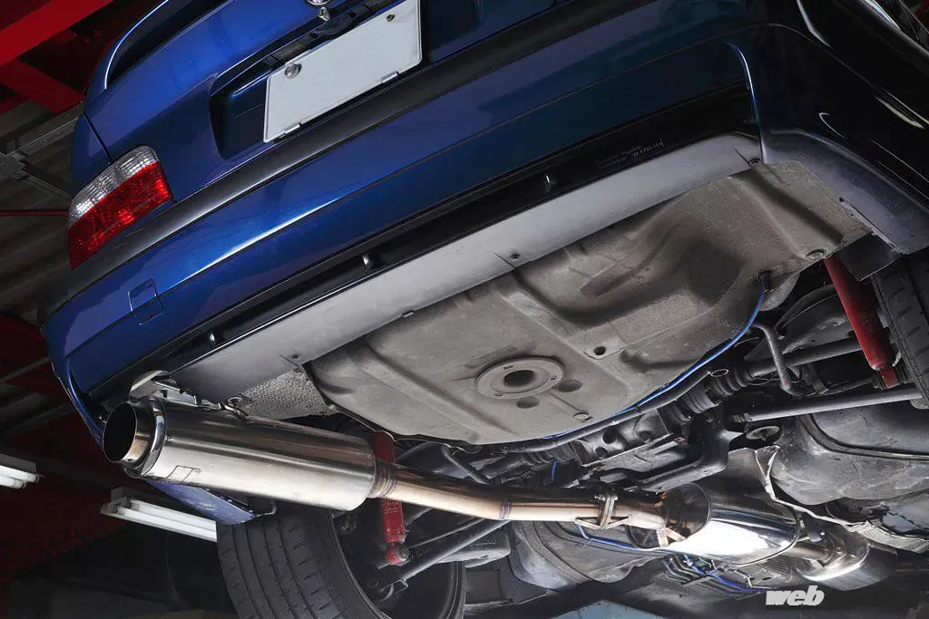 音質の追求も忘れてはいない。サブサイレンサーは低音のこもりを抑えるために装着し、メインサイレンサーはタナベ製で共鳴管構造を採用することで、直6エンジンが放つエキゾーストサウンドをより甲高くクリアなものへと生まれ変わらせている。ちなみに、以前FD3SのNAブリッジポート仕様に乗っていたというオーナーも、このサウンドには大満足とのことだ。