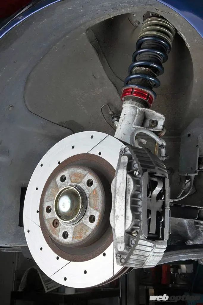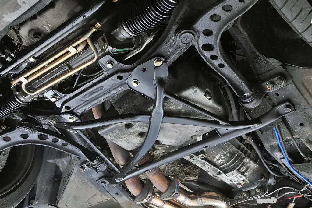 また、サスメンバーはカブリオレ用クロスブレースバーで剛性アップが図られる。ブレーキは、ブラケットを介してR32用4ポットキャリパーをセットしているのが面白い。