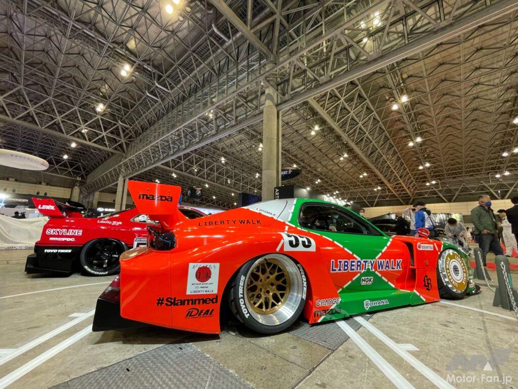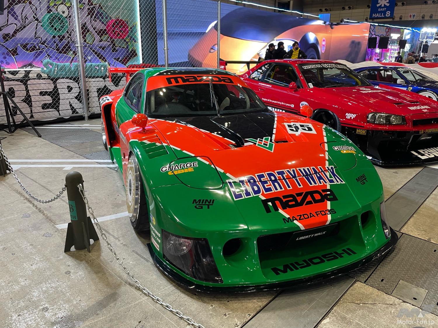 「マツダ・RX-7(FD3S)」は、ル・マン24時間レースで活躍したマツダ787Bをイメージしたカスタム。ノーズは長く延長し、フェンダー拡幅されるなど迫力のスタイリングを実現している。