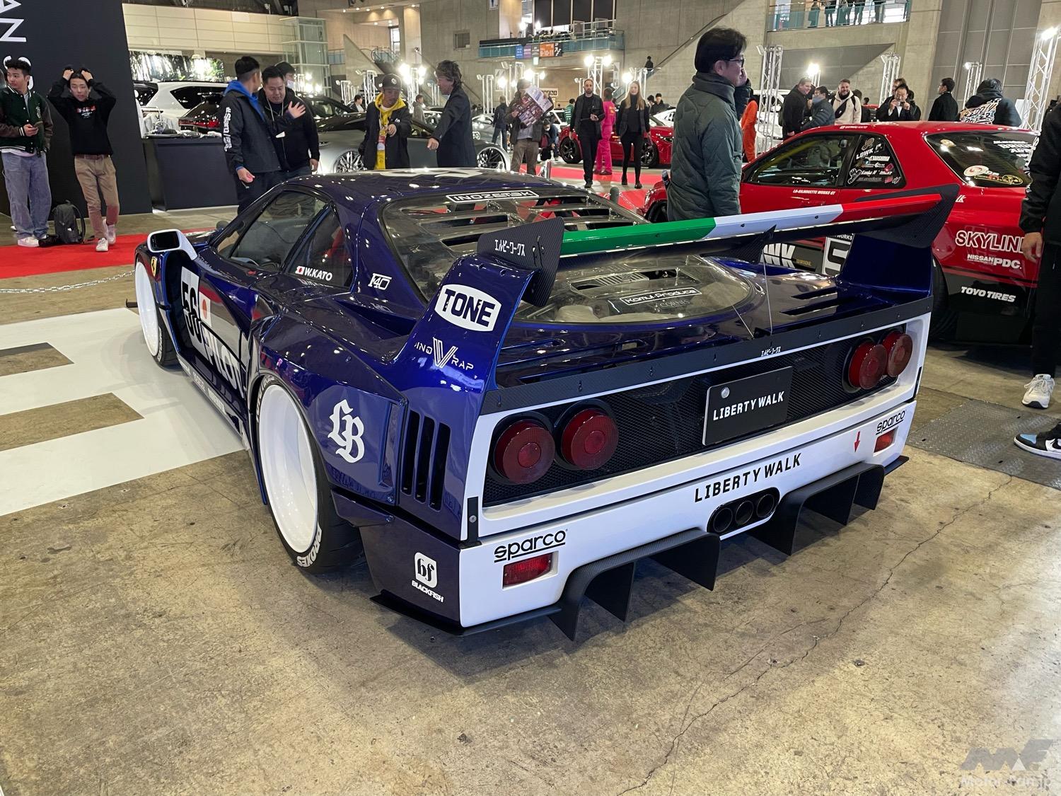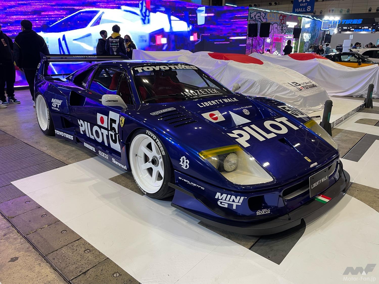 その他にも、ブルーにカラーリングされた「フェラーリ F40」は、ル・マン24時間に参戦したパイロット・レーシング風にカスタム。得意のワークスフェンダーでワイド化され迫力のスタイルとなっている。サスペンションは車高調で地面スレスレまで下げられている。