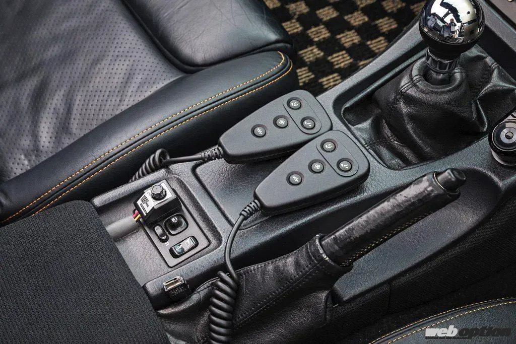 シートにはレカロSP-JCベースの350リミテッドを2脚装備。Z32用は設定がないため、シートレールは加工している。電動スライドやシートヒーターのコントローラーはセンターコンソールに設置。