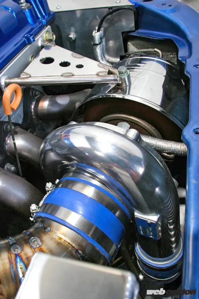 装着するタービンはトラストのT78-29D。この大きさのタービンなら排気量を上げているのだろうと思いきや、1.6Lのままだったりする。当然、1.6LにT78タービンの組み合わせとなると「低回転域ではスカスカなのでは?」という疑問が湧く。