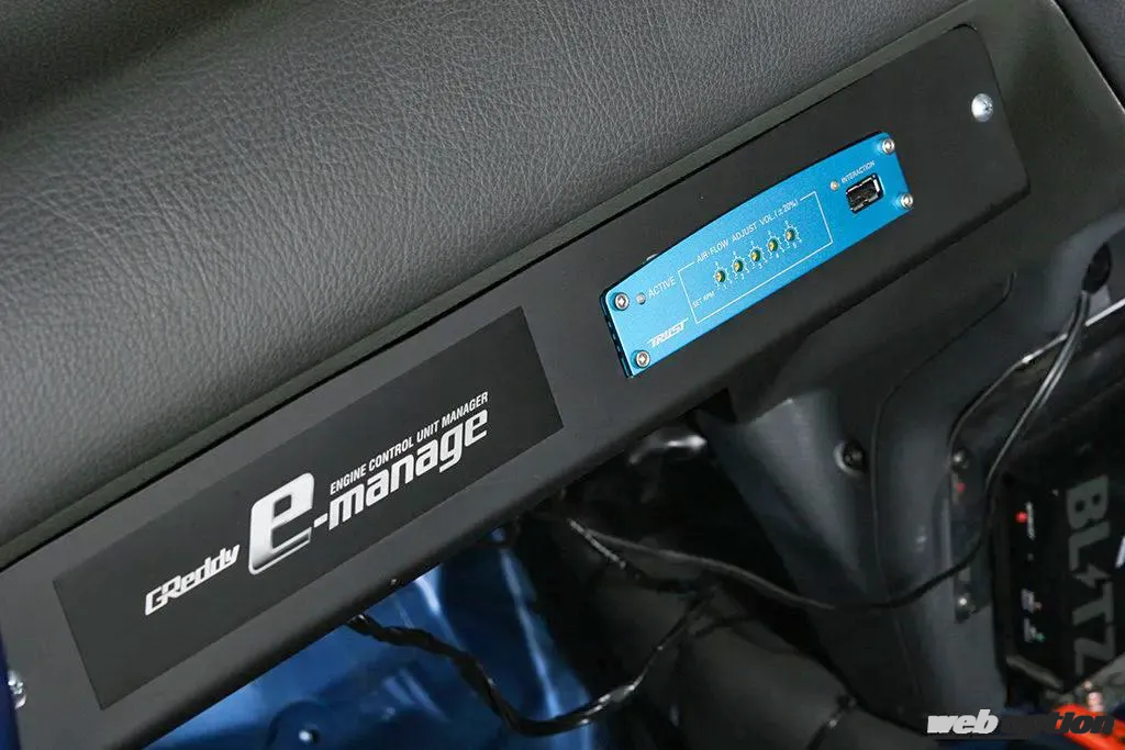 制御系にはトラストのeマネージを使用。もちろん、F-CON Vプロ等のフルコンで制御した方がセッティング面では有利なのだが、サブコンでもここまでの仕様に対応できるということをアピールする狙いもある。