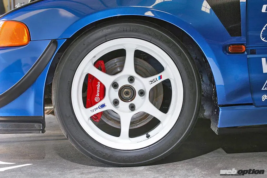 ハイパワー化への対応、そして旋回性能をさらに高めるべく、フロントフェンダーをブリスター化して225サイズを装着。さらにブレーキはフロントにDC5純正のブレンボ、リヤにはDC2インテグラ98スペックのキャリパーを移植。フロントはキャリパーのみの流用が出来なかったことから、ハブごと交換されている。車高調はクラックスでバネレートはフロントが22kg/mm、リアが18k/mmだ。