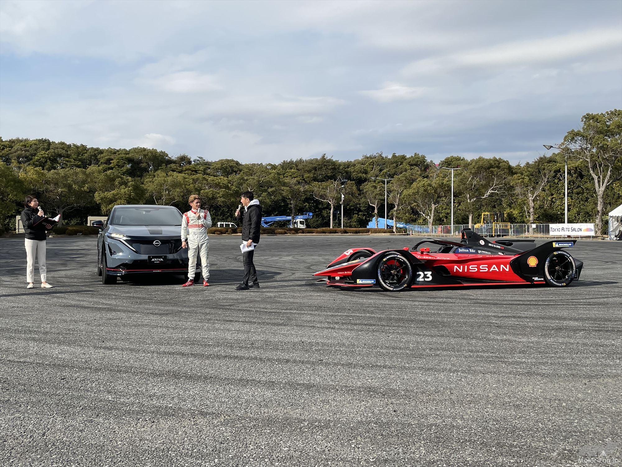 「ここ(屋外イベント会場)結構、砂利がすごいじゃないですか。だから一般道より滑りやすいと思うんですけど、それでもまったく滑らないので、雪道でも絶対大丈夫だと思います」と話し、同じ日産陣営のドライバーで、ゲストとしてイベントに参加した松田次生とともにe-4ORCEの駆動制御の性能に太鼓判を押した。
