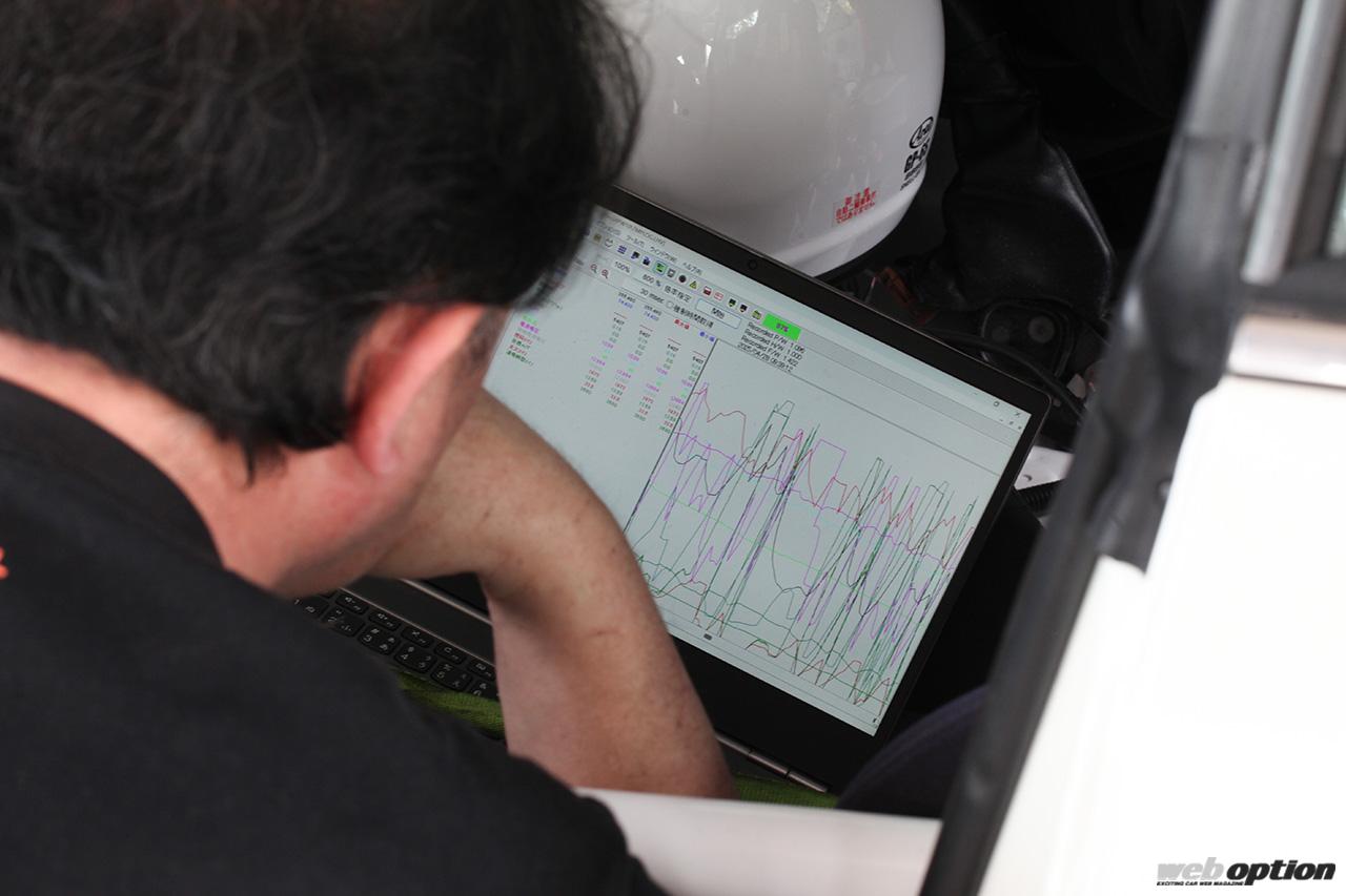 ピットインを繰り返し、ステアリングを握った藤田さんのコメントに耳を傾けながら、パソコン画面に映し出したVプロのログデータを細かく検証、修正する永井さん。マシンの完成度を高めるための地道な作業が二人三脚で続けられる。