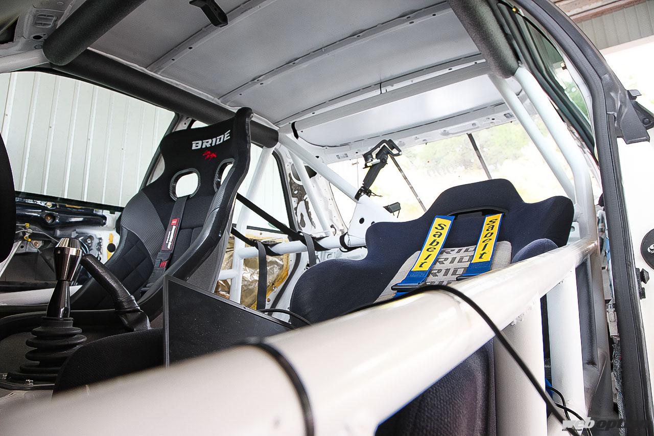 ロールケージが張り巡らされた室内。センターアーチの左右を繋ぐクロスバーや上下2本で組まれたサイドバーなど、クラッシュ時の安全性を確保しながら、ボディ剛性の向上にも貢献する。