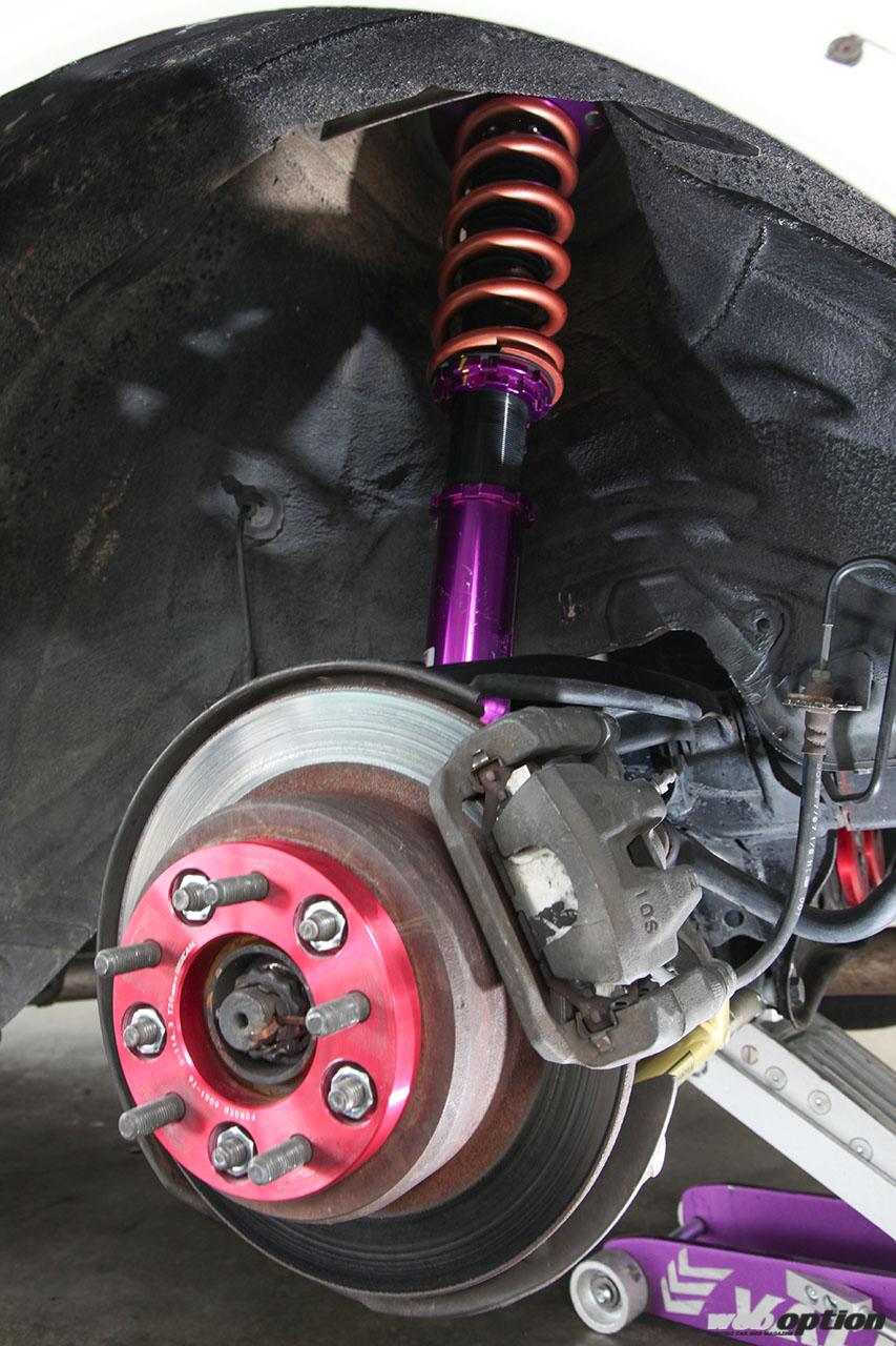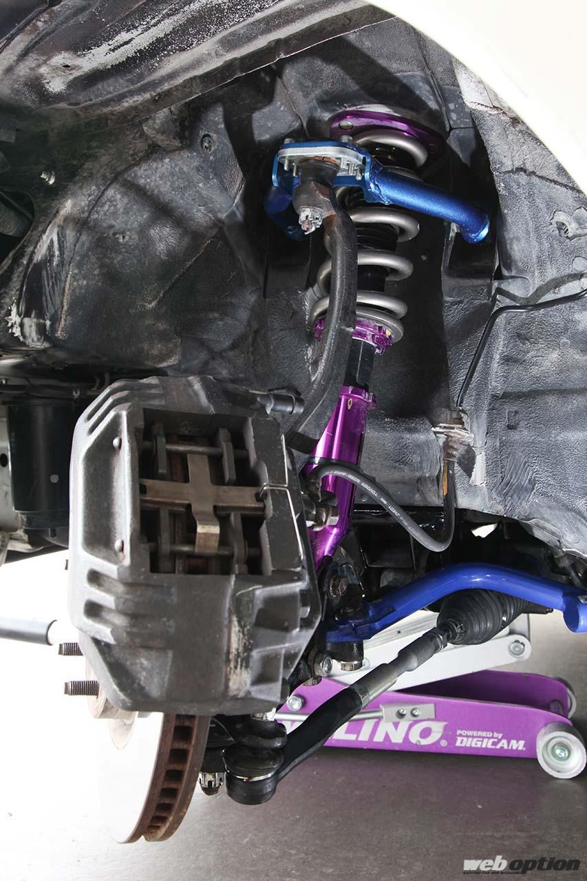 足回りは、必須と言える切れ角アップとセッティング幅の拡大を狙ってパーツをセレクト。車高調はD-MAXスーパーストリート。スプリングレートはフロント26kg/mm、リヤ14kg/mmとなる。調整式アッパーアームはクスコ製、ロワアームはD-MAX製が組まれる。タイロッドはイケヤフォーミュラ製、タイロッドエンドはJZX110純正という組み合わせだ。また、リヤサスにもイケヤフォーミュラ製調整式アームを導入。幅広いセッティングを可能にする。