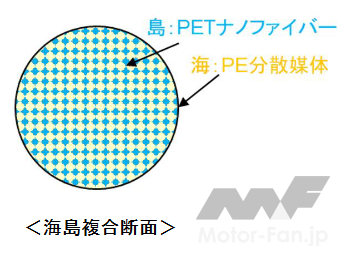こうした中、帝人は、ゴム補強用短繊維の断面をポリエステルナノファイバーとポリエチレンの2種類のポリマーを配した海島複合断面(*1)とすることで、少量の添加であっても従来品と同等以上の補強効果を発現し、かつ環境負荷低減を実現するゴム補強用のポリエステルナノファイバー短繊維を開発した。