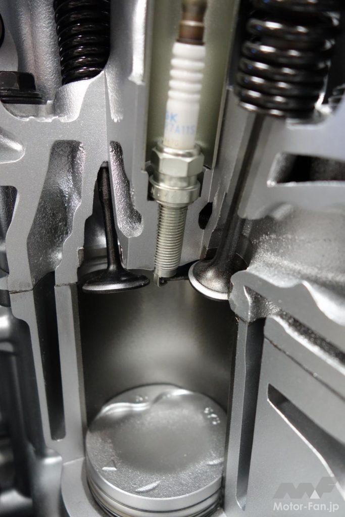 ホンダはきちんとこれらに対処してきました。バルブ面積を極力稼ぐために目を付けたのが、点火プラグ。従来のねじ径が12mmだったところ、10mmに縮小しました。おそらく、M12に対してM10はねじ長さも増やしているだろうと思いますが、そうすると点火プラグの熱逃げ性も高めることができます。いっぽうで耐久性には相当気を払っただろうと想像します。