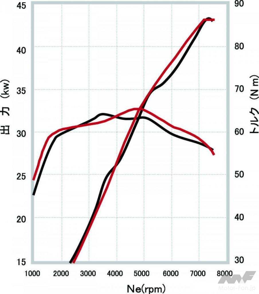 バルブリフト量の解決はお察しのとおり。伝家の宝刀VTECの採用です。仕組みと効能については皆さんもよくご存じでしょう。ロッカアームを切り替えることで、低回転高応答と高回転大量吸気を両立させているわけです。エンジニア氏によれば、切り替え回転数は4500rpmあたりとのこと。なるほど、出力曲線を眺めても、そのあたりを境に出力カーブが折れているのが見て取れますね。