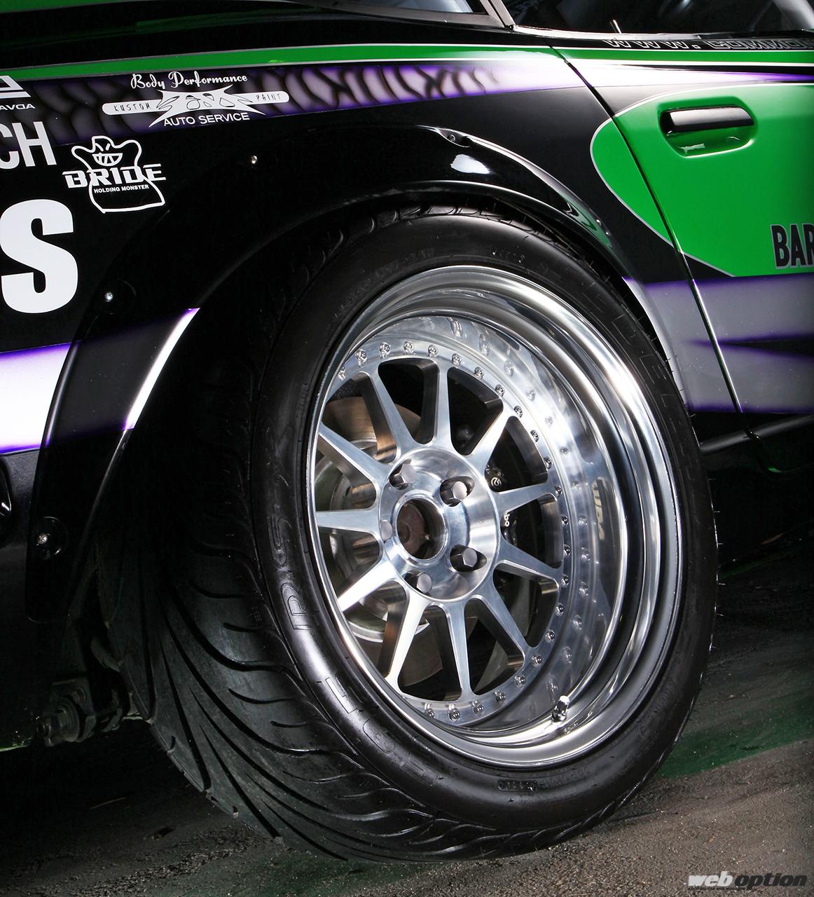 ホイールはオリジナルの「バラマンディ・デザイン」で、軽量・高剛性・スタイリングの要素を高い次元でバランスさせたフル鍛造3ピースの自信作。サイズはフロント17×9.0J-10、リヤ17×9.5J-30で、タイヤにはフェデラル595RSをセットしている。