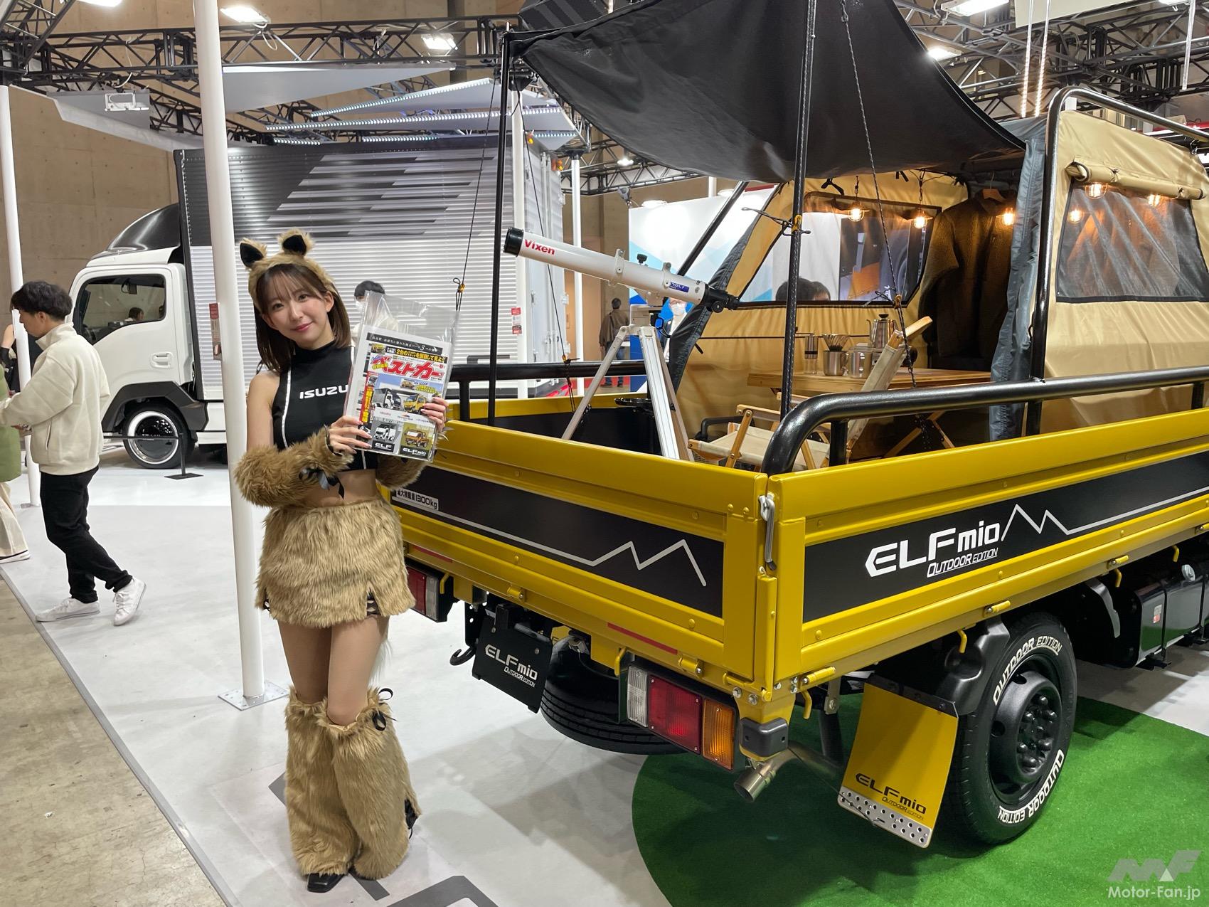 いすゞグループとしてオートサロン初出展となったいすゞA&S(アクセサリー&サービスパーツ)のブースには、エルフミオの荷台を動くキャンプ場に見立てた「アウトドアエディション」が展示されていた。