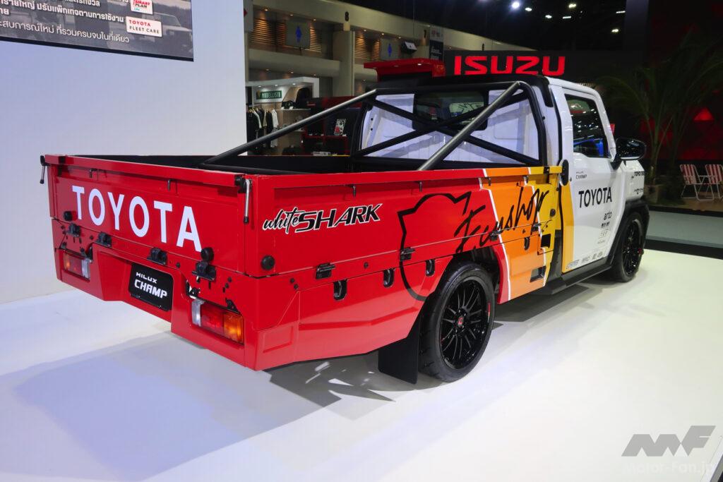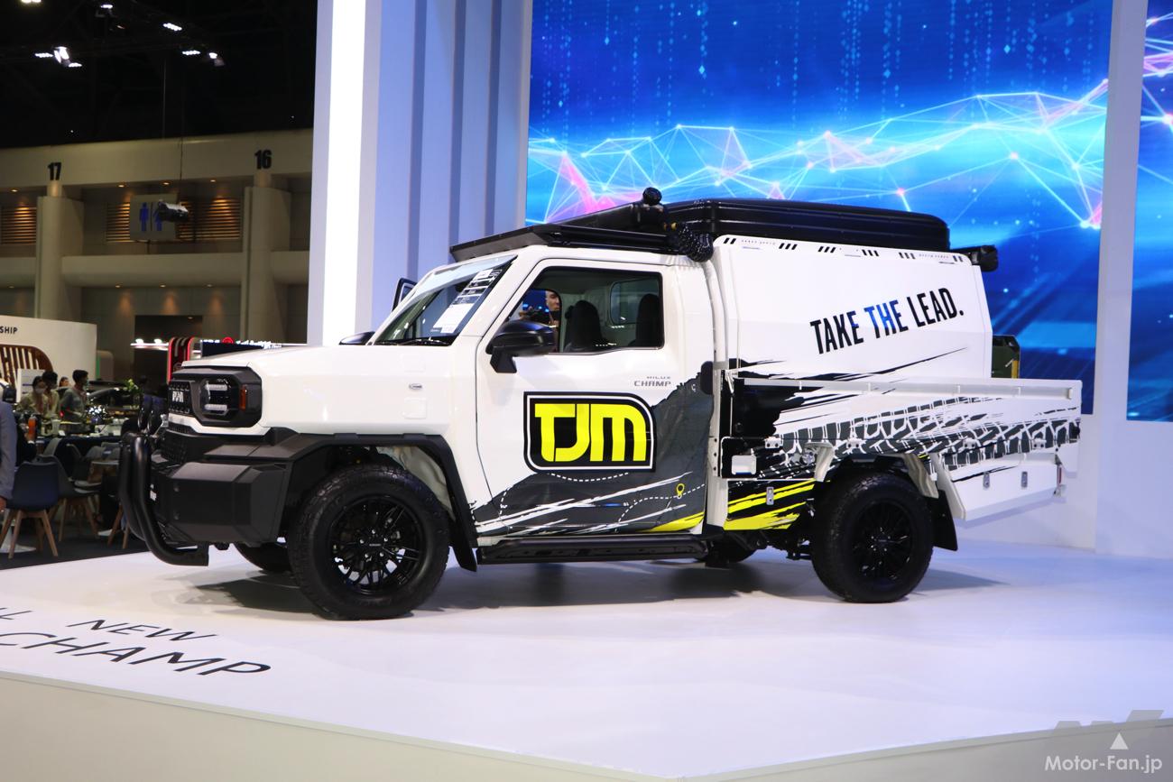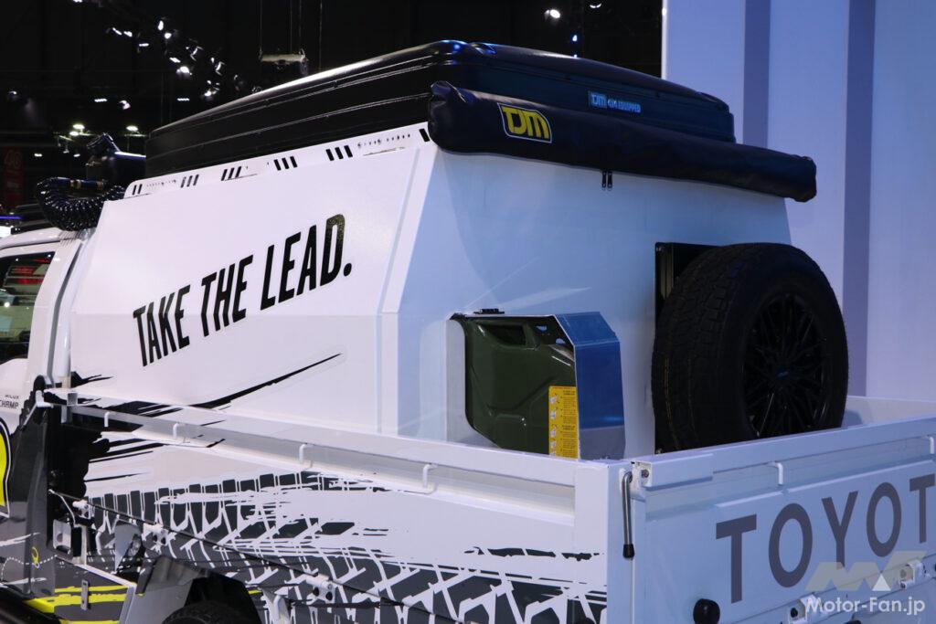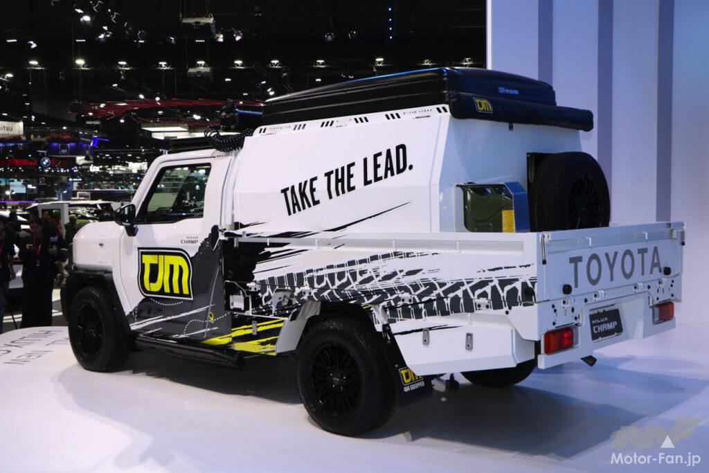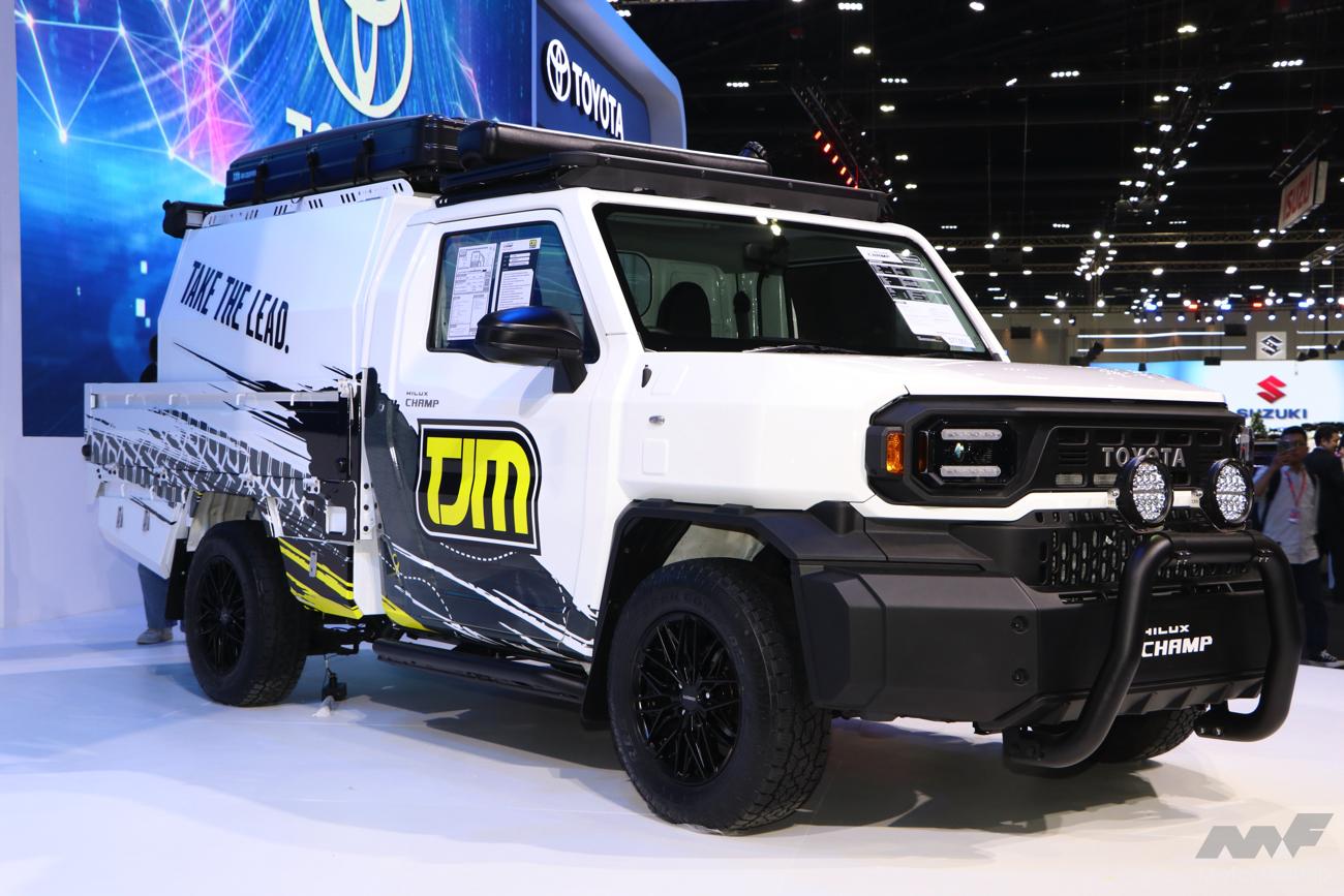 モーターエキスポの会場では、その可能性をアピールすべく、架装済みのハイラックスチャンプを参考出品。キャンピングカーは、TJM 4×4 Thailandが手掛けたもの。ルーフテントを備えたアウトドア要素が強い仕様となっており、荷台にある収納ボックスには格納式キッチンも備えている。ワイルドなハイラックスチャンプのスタイルを見事に生かしたデザインとなっている。