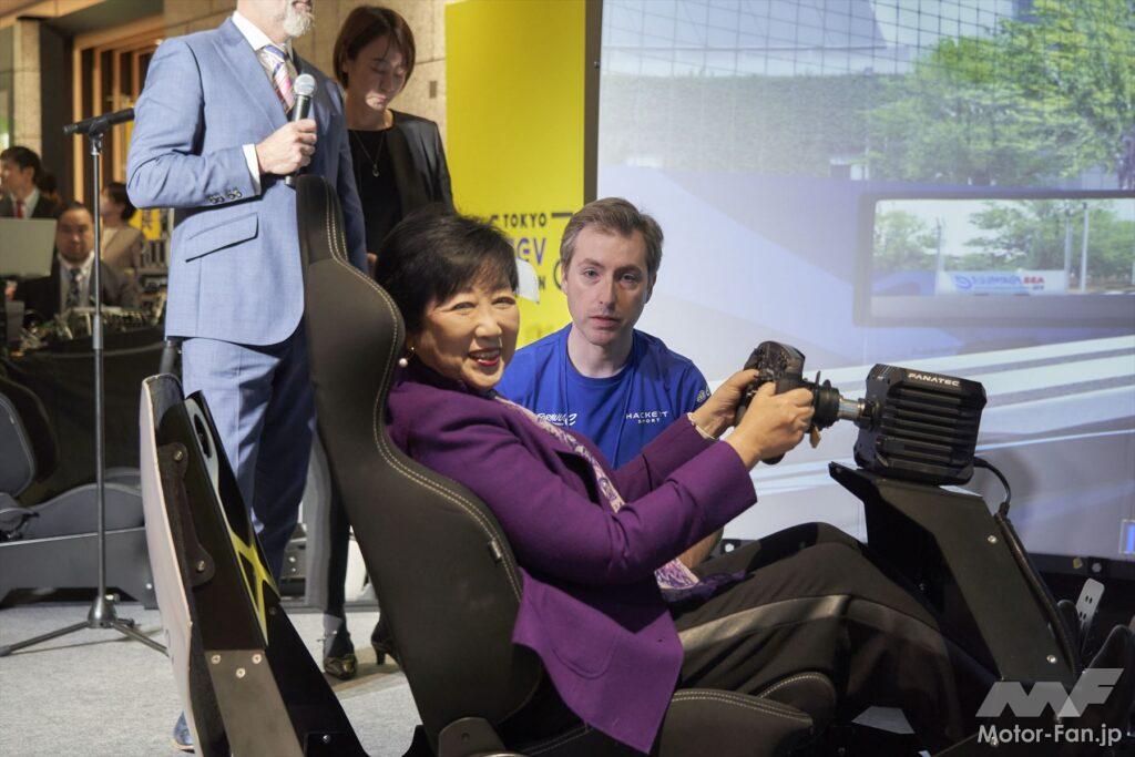また、このイベントではレーシングシミュレーターが設置された。これには東京ビッグサイトとその周辺道路を用いた東京E-Prixのコースが再現されており、小池知事も体験した。このシミュレーターは24日まで都庁に置かれる予定だ。