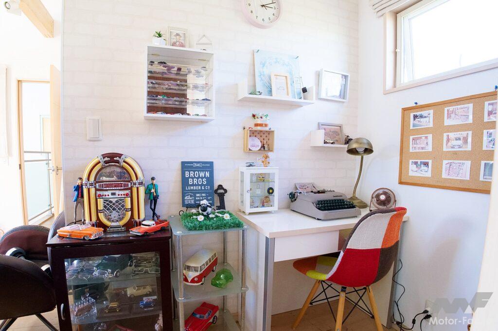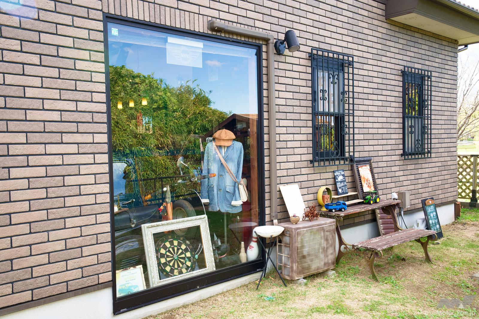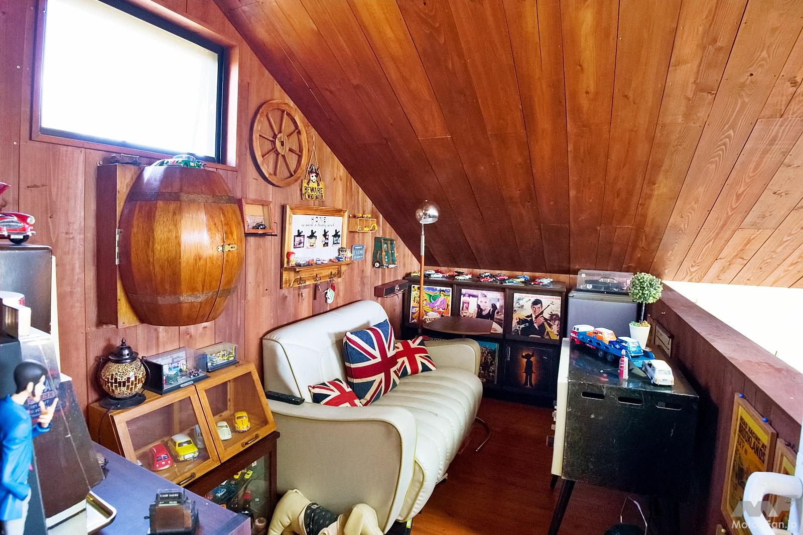 ひとつひとつのグッズを取り上げると切りがないが、おそらく数にすると1000点以上はあるだろう。その一例を挙げると、ミニチュアカー、テーブルやイスなどのファニチャー類、写真やポスター、壁掛け時計、蛍光管式ディスプレイ、革製トランク、レコードプレーヤー、ラジオ、タイプライターなどが整然と隙間なくディスプレイされており、マニアならばヨダレが出そうなミニにまつわるグッズやアンティークグッズで埋め尽くされている。とにかくガレージハウス全体が、まるで大人のオモチャ箱のような空間に仕立てられていて、これぞ究極のガレージライフという印象だ。