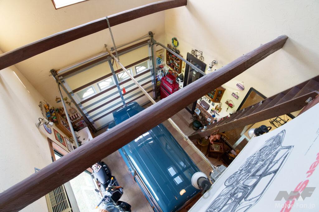 設計にあたってイチバン重要視したのは、クラシック・ミニを俯瞰して(上から)見れるようにすること。実際にkumaさんのガレージハウスに伺ってみると、ガレージと接する1階ダイニングやガレージ右側面はガラス張りになっていてガレージを見渡せるほか、ガレージ上部に設置されたロフトからもガレージの全景とクラシック・ミニの俯瞰ショットを愉しむことができる。これはガレージハウスとしては、まさに理想的といえる構造で、その素晴らしい設計に思わず息を飲んでしまった。
