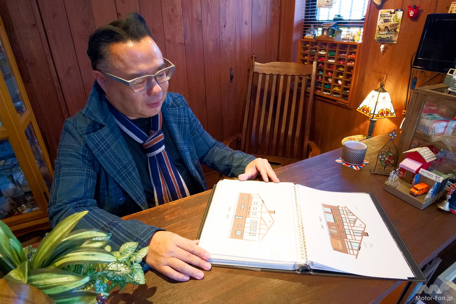 20歳のころに念願だったクラシック・ミニとの生活をスタートしたkupaさんは、それだけでは飽き足らず、家にいるときもクラシック・ミニをさまざまな角度から眺めていたいという想いにかられ、18年前にガレージハウスの建築を決断!建築にあたっては、自分の想いやイメージを業者さんにより具体的に説明するため、得意のイラストを何枚も描いて業者さんとの詰めを行ったそうだ。