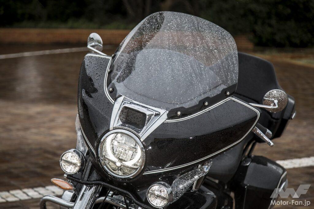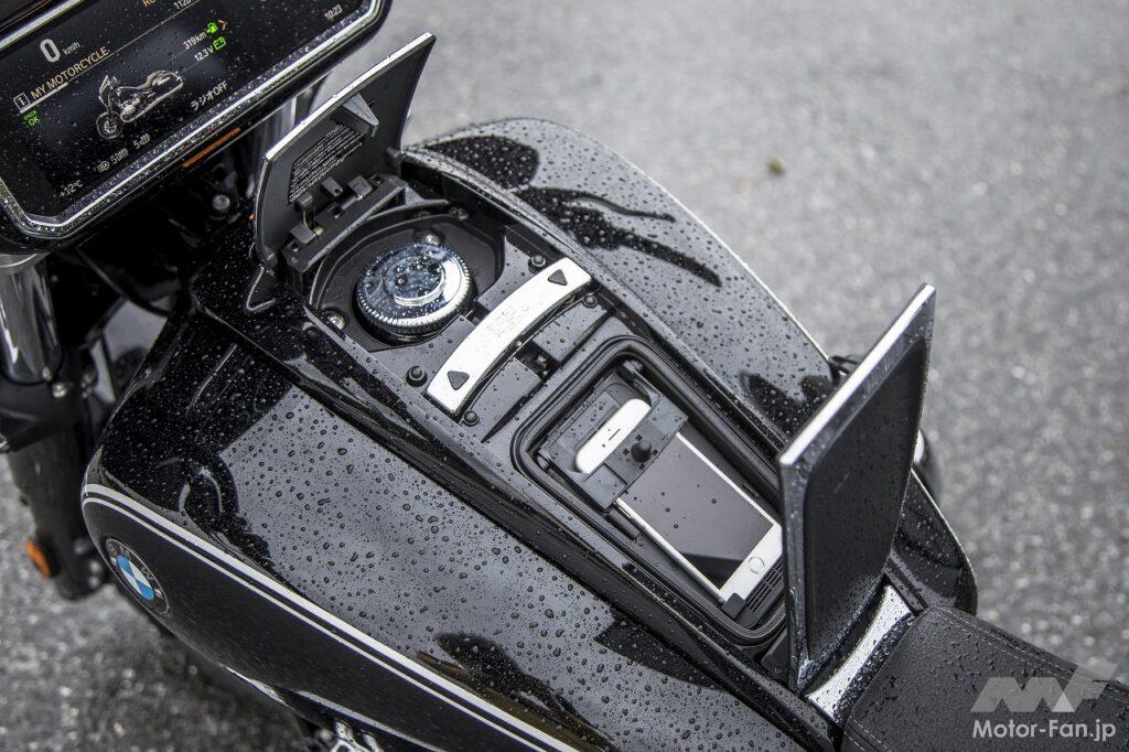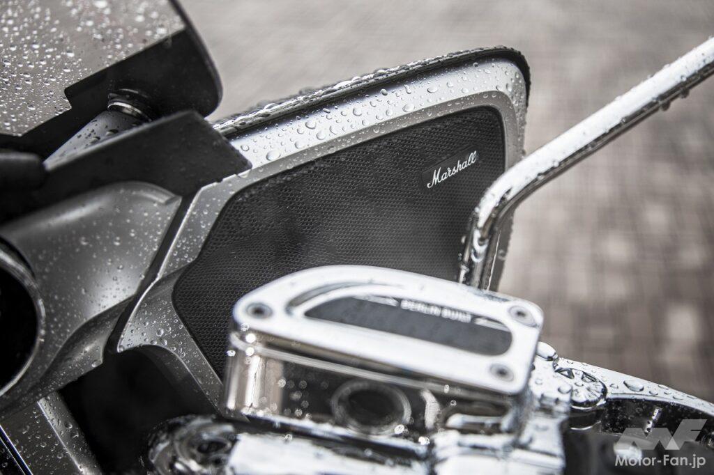 そして、速度が上がるにつれ大型フロントカウルが威力を発揮。当日の冷たい雨の中でもほとんど濡れないし、標準装備のグリップ&シートヒーターはとても有難かった。コックピットも斬新だ。ワイドサイズのTFTディスプレイの上に並んだアナログ4連メーターはBMWのスポーティセダンのようでクール。カウル内側に埋め込まれたマーシャル製のスピーカーが奏でる高品質なサウンドがラグジュアリーな旅へと誘ってくれる。