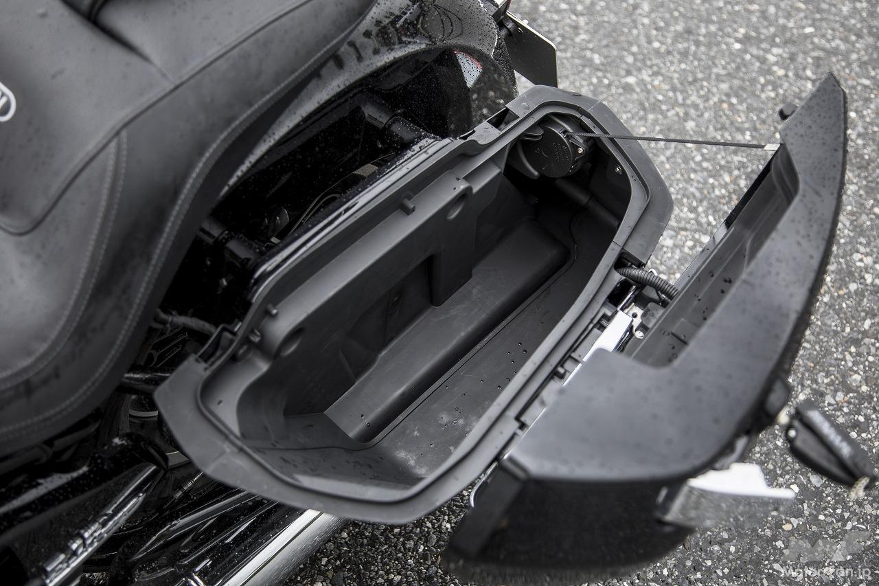 TCから試乗したが、フラットツインの低重心のおかげか、その巨体の割に取り回しは楽。路面に傾斜があると車重440kgはさすがに動かせないが、そんなときのために電動リバースギアが付いている。いざというときは、スイッチひとつで跨ったままでもバックできるので安心だ。ライポジも大柄ではあるがR18に比べるとハンドルはやや近め。16Lから24Lへと増量されたタンク形状によりニーグリップもしやすくなっている。