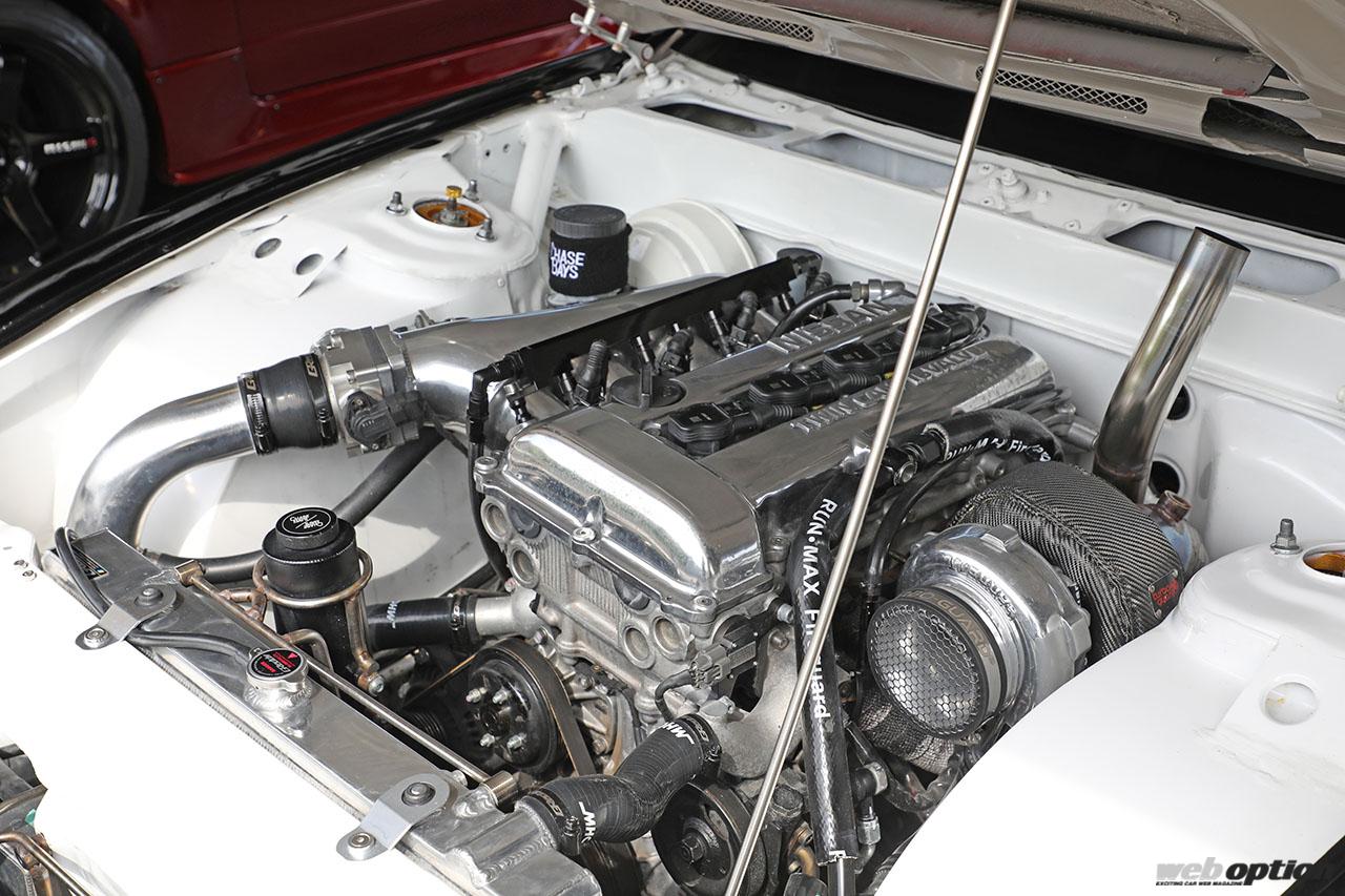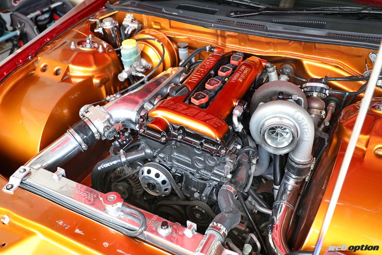 エンジンはHKSのキャパシティアップグレードキットで2.2L化した腰下に、ナプレックのハイレスポンスキットとギャレットのGBC35-700タービンをセット。LINKのフルコン制御で620psを発揮する。エンジンベイのディテールにこだわり、サイクルフェンダー化やパウダーコート処理、電動ファン化などが施されているのも特徴的だ。