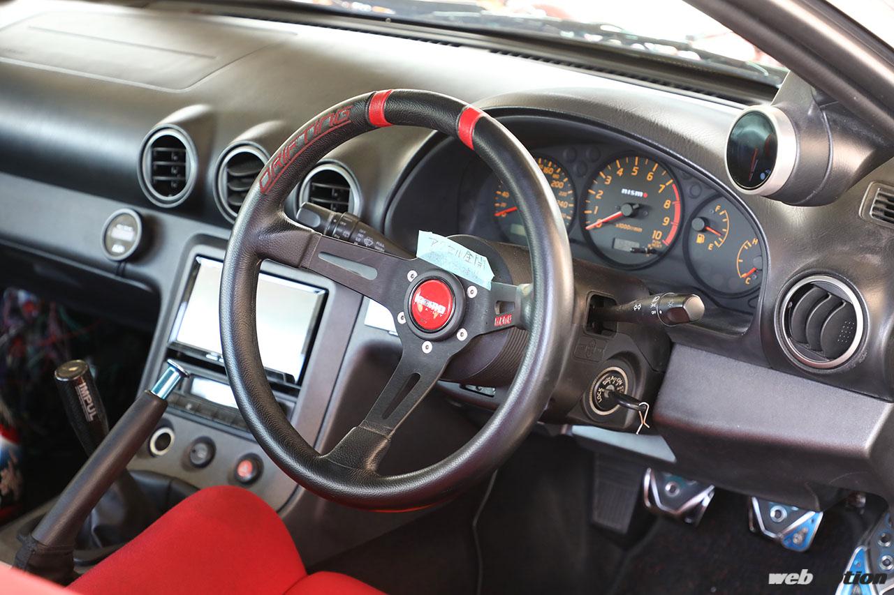 ステアリングコラムにはLINKのディスプレイが装着され、余分な装備を排除したダッシュまわりからは軽量化へのこだわりも伝わってくる。ステアリングはなんとD1で実際に使用されていた、ノムケンのサイン入りという貴重なお宝だ。