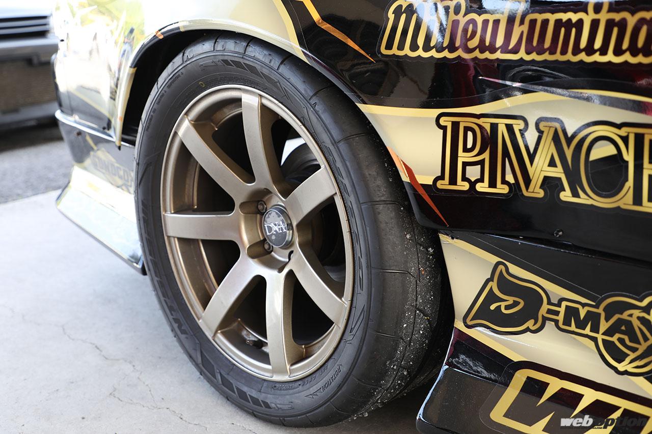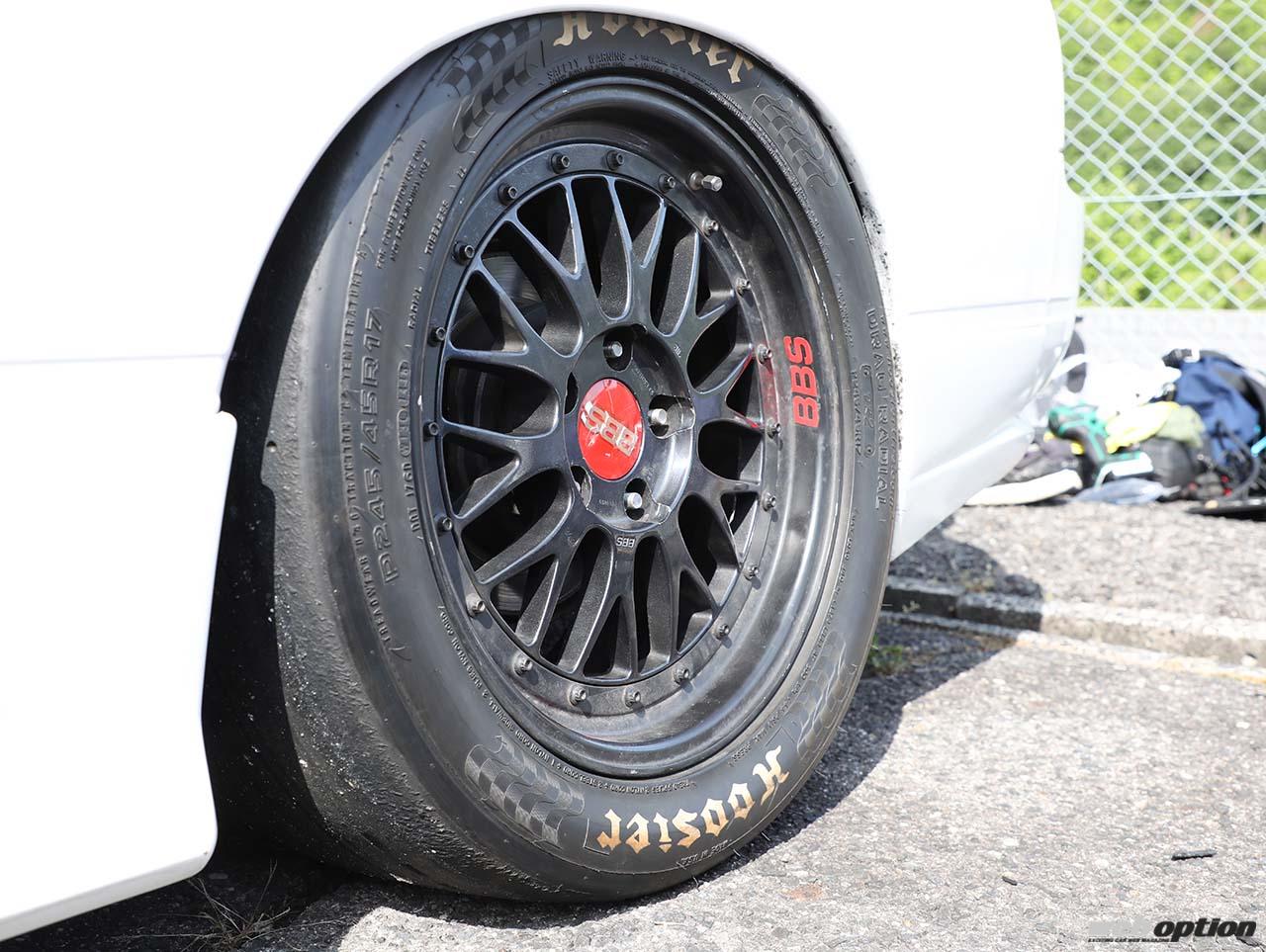 タイヤにはフージャーのドラッグラジアル(245/45R17)をセットし、フェンダーとのクリアランスはギリギリ。これまでのベストは13秒185で、今後は13秒切りを狙って挑戦を続ける。