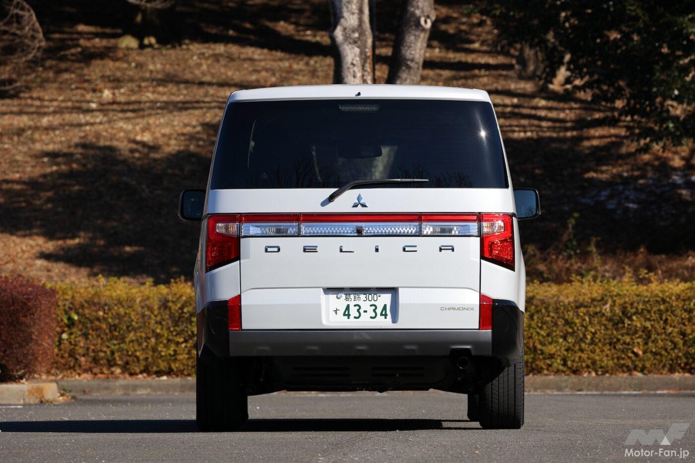 デリカD:5シャモニー(コンプリートパッケージ装着車) 全長×全幅×全高:4800mm×1795mm×1875mm ホイールベース:2850mm 車重:1970kg サスペンション:Fマクファーソンストラット式 マルチリンク式 駆動方式:4WD エンジン形式:直列4気筒DOHCディーゼルターボ エンジン型式:4N14型 排気量:2267cc ボア×ストローク:86.0mm×97.6mm 圧縮比:14.4 最高出力:145ps(107kW)/3500rpm 最大トルク:380Nm/2000rpm 過給機:ターボ 燃料供給:コモンレール式筒内燃料直接噴射 使用燃料:軽油 燃料タンク容量:64L トランスミッション:8速AT WLTCモード燃費:12.6km/ℓ 市街地モード10.1km/ℓ 郊外モード12.6km/ℓ 高速道路モード14.1km/ℓ 車両価格:491万6670円(電動サイドステップ装着車)