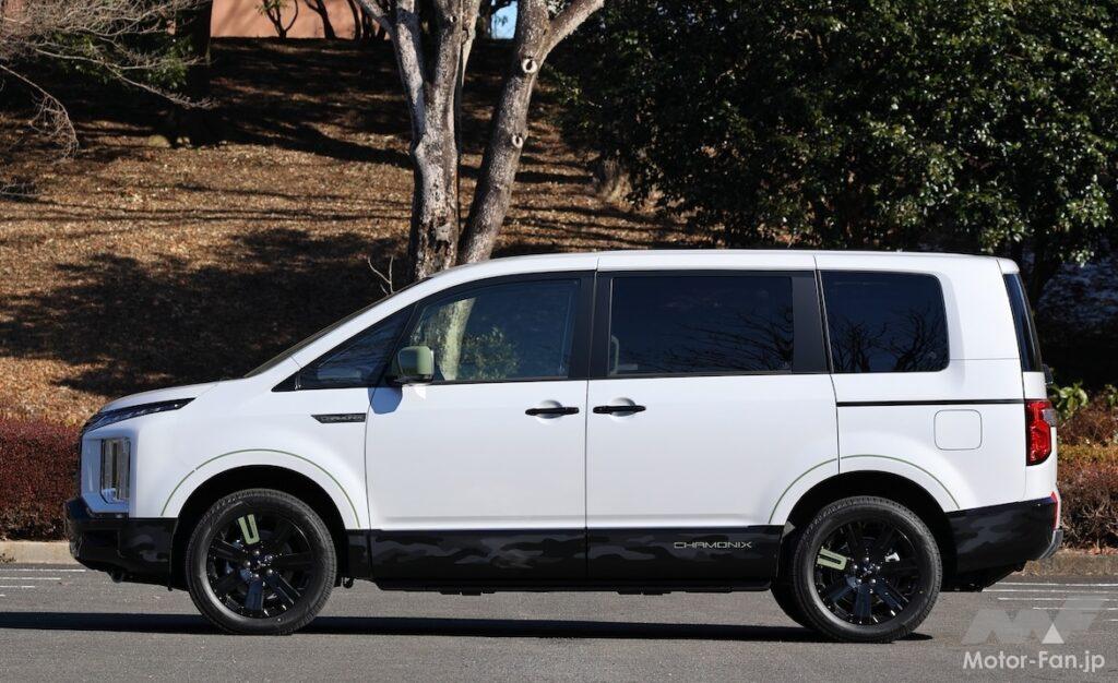 2023年11月24日に発売されたデリカD:5 CHAMONIXは、最上級のPグレードをベースに専用の外装・内装デザインを施した特別仕様車だ。エクステリアでは、フロントグリル、ポジションランプガーニッシュ、フォグランプベゼル、アウタードアハンドルなどをブラックマイカで統一。18インチアルミホイールはブラック塗装となる。また、テールゲートに配したCHAMONIXのロゴは雪山に生える針葉樹をイメージした専用のグリーンを採用している。