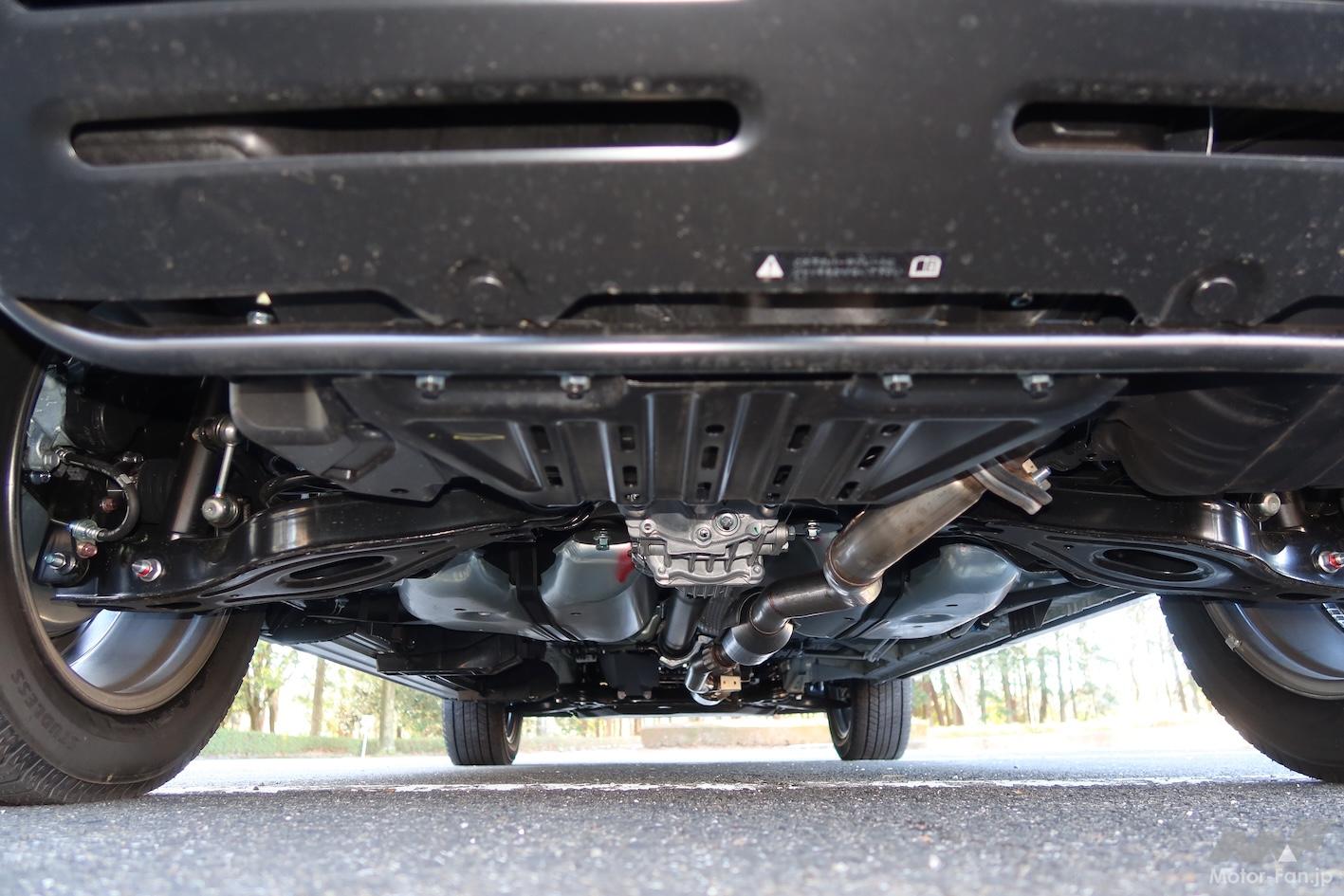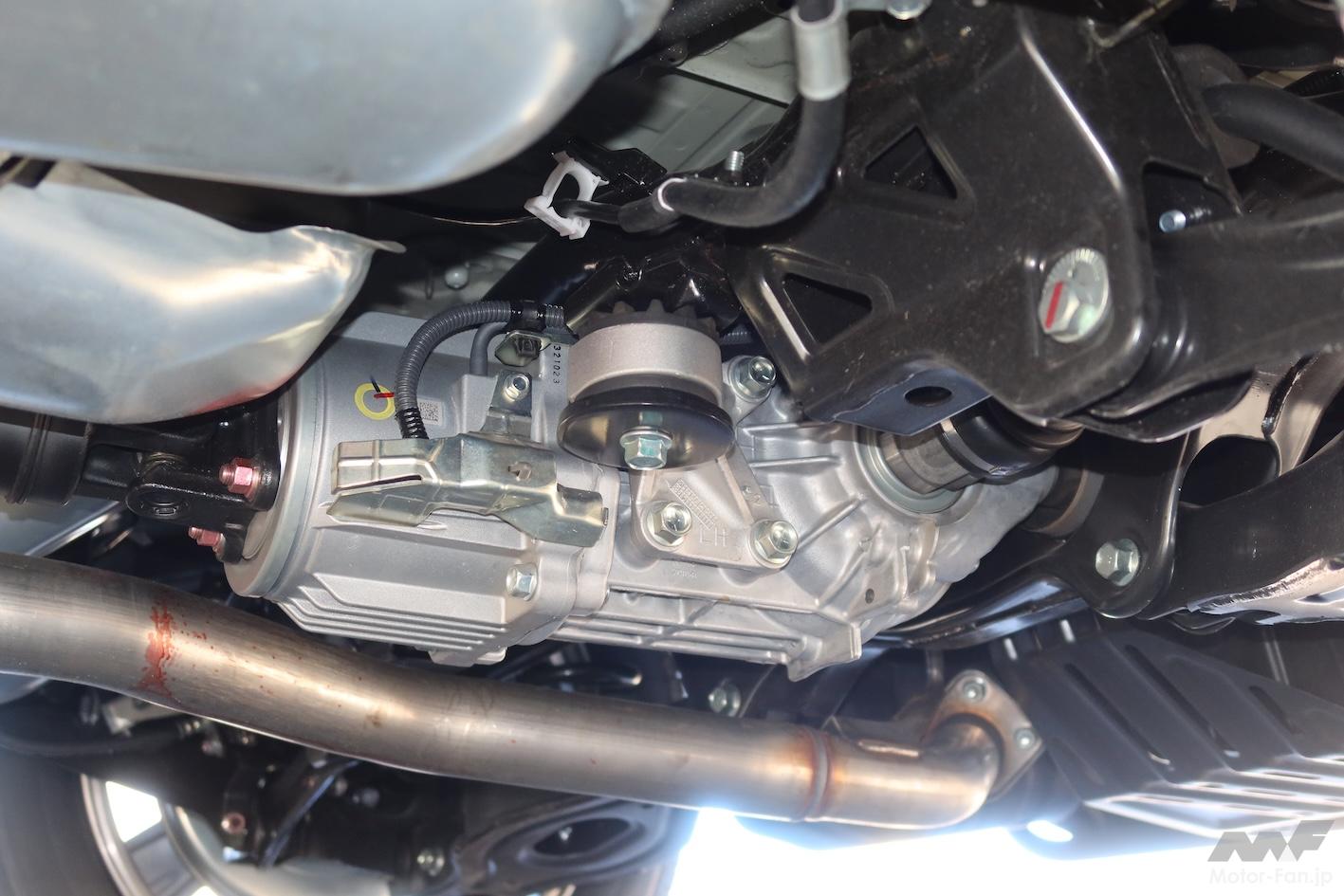 4WDユニットはリヤデフ前に搭載する電子制御カップリングを用いたもので、ドライバー操作や車両挙動をもとに後輪への伝達トルクを決定し、制御する。センターコンソールにあるシフトレバー横にダイヤルスイッチがあり、2WDと4WD AUTO、4WD LOCKの3種類を選択することができる。