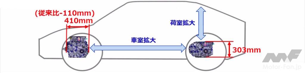 さらに、インバーターをトランスアクスルに内蔵するBuilt-in構造、モーターの小型化、アウトプットシャフト採用による軸間短縮といった技術で、eAxleの大幅なコンパクト化を実現している。フロントは前後方向の長さ、リアは高さを低減し、車内空間や荷室空間の拡大に寄与している。