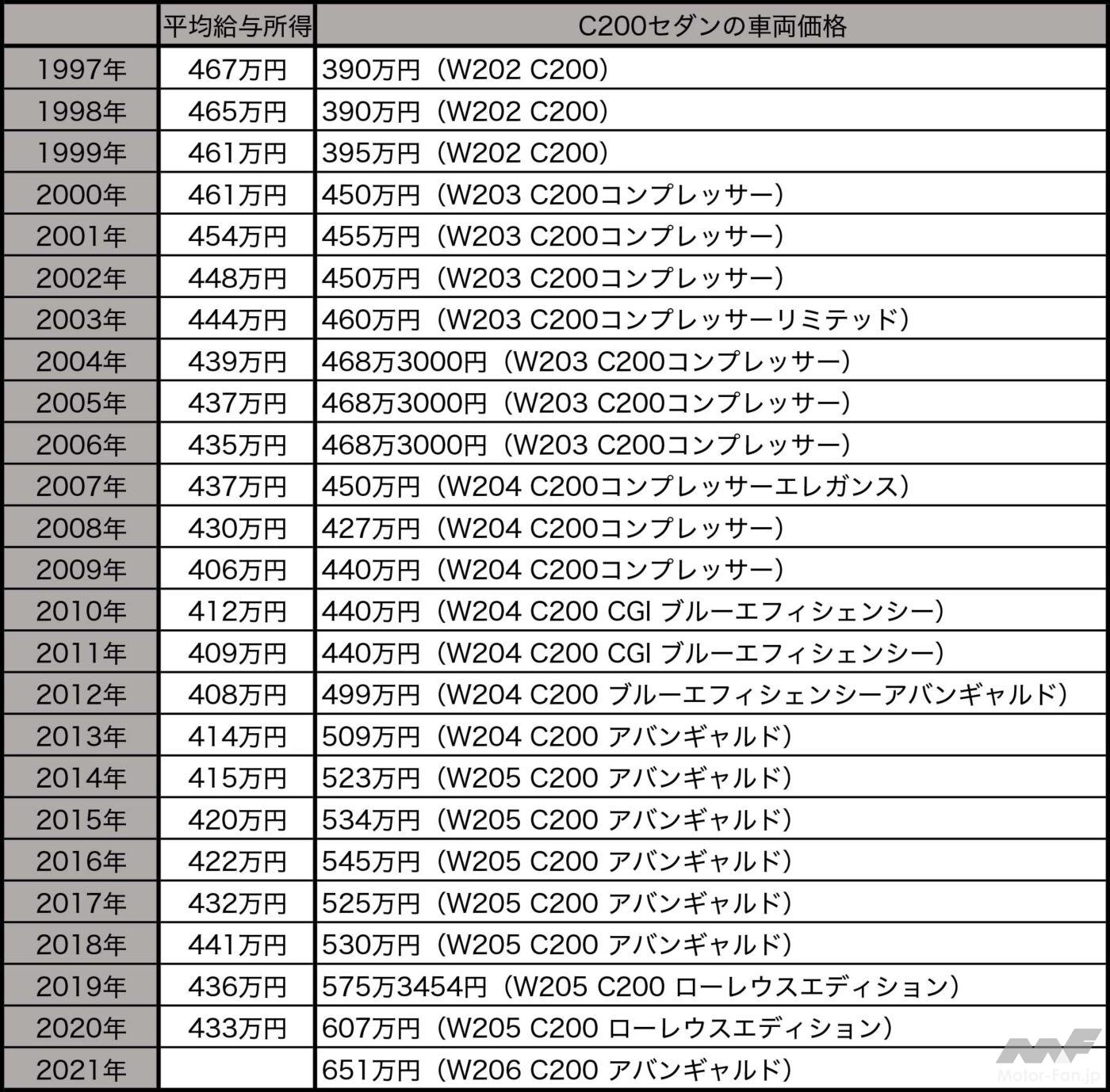 車の知識 メルセデスCクラスの価格と平均給与の推移を比較する【写真・2枚目】 新型メルセデス・ベンツCクラスの主力グレードC200セダンの価格は654万円 最新のポルシェ911は「Type992」2019年の992型ポルシェ911カレラの価格は1359万7222円。現在は1429万円だ。 1998年996型ポルシェ911カレラの価格は990万円だった。 折れ線グラフが民間平均給与の推移。棒グラフがメルセデス・ベンツC200セダンの価格の推移 出典:「oecd.statより全労連が作成(日本のデータは毎月勤労統計調査によるもの)」 1997年〜2020年 民間平均給与の推移 メルセデス・ベンツC200セダンの価格の推移と民間平均給与の推移 日産スカイラインGT-R(R33型)の価格は485万5000円だった。 2012年の991型ポルシェ911カレラの価格は1115万円 1997年993型ポルシェ911カレラの価格は910万円だった。 この画像の記事を読む