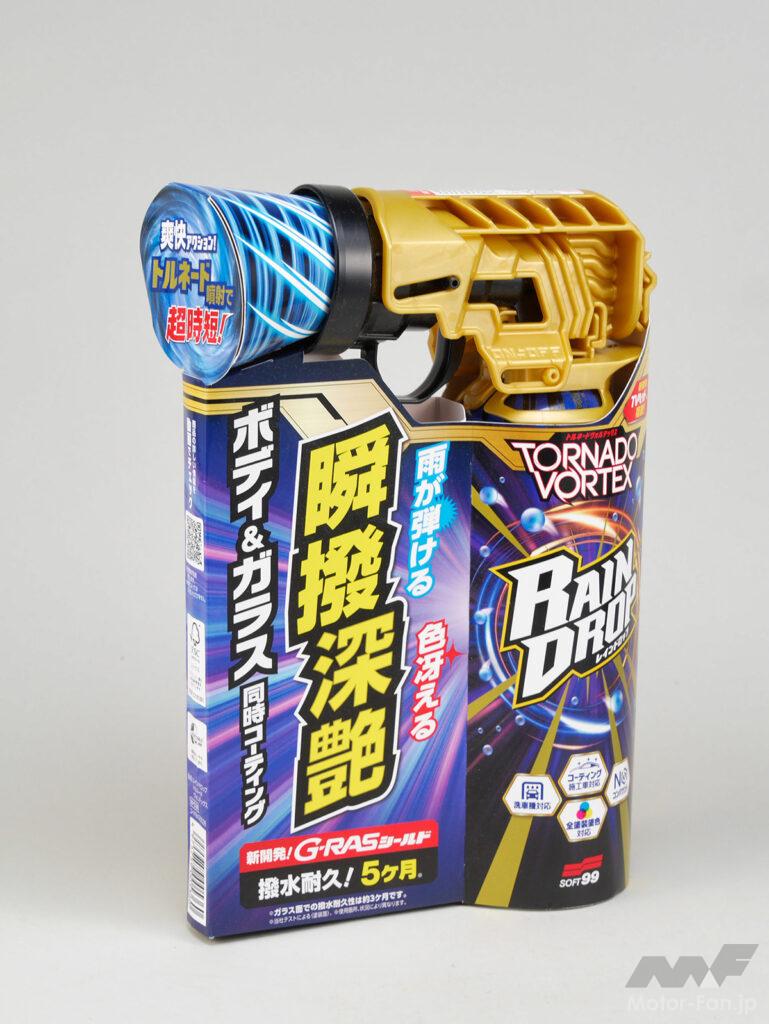 ソフト99の『レインドロップ トルネードヴォルテックス300mL』も、シリーズ拡充の追加作のように見えて、より広範囲に拡散させる能力は既存のレベルを大きく超えるものだった。洗車に要するスピード化が要望されるなか、一度のプッシュで広範囲に噴射できるスプレー力は、その対処として極めて有効なものになる。