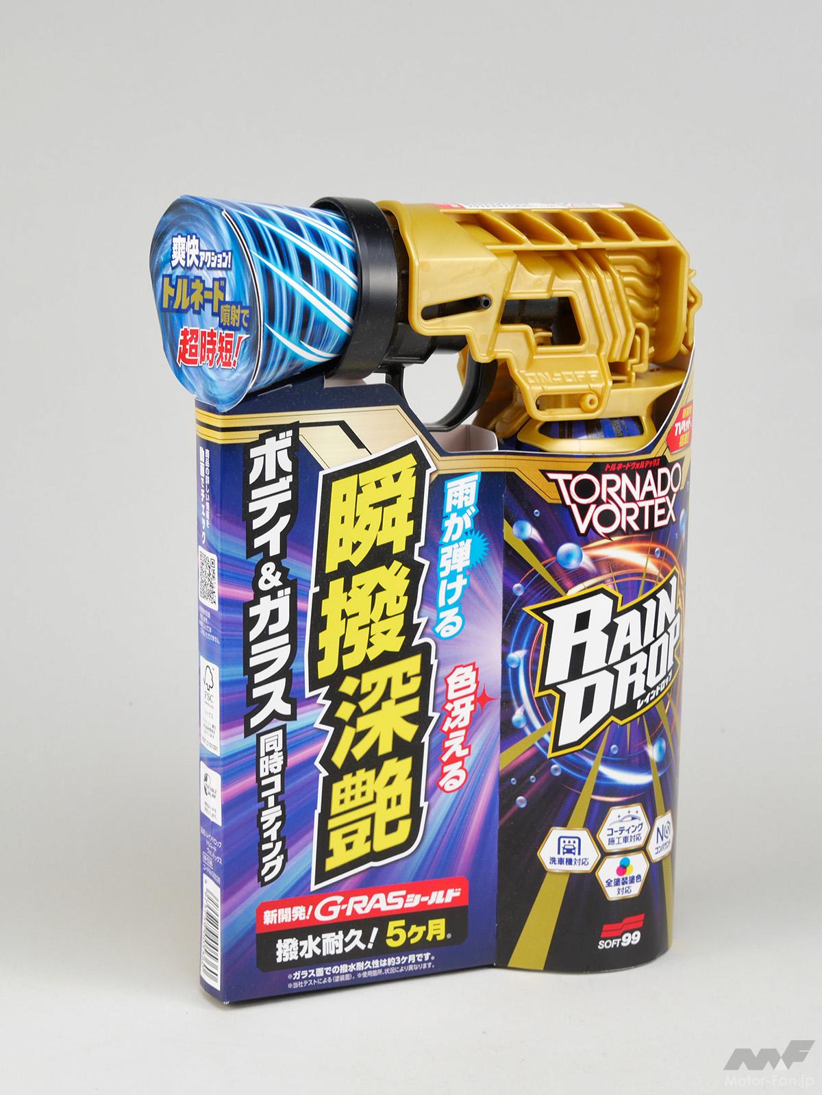 時短コーティング剤として人気のレインドロップシリーズに加わるニューフェイス。新技術となるG-RASシールドを採用して撥水耐久性が増し、トルネード式に噴射する新開発のTVヘッドを採用してより広範囲に散布可能となっている。