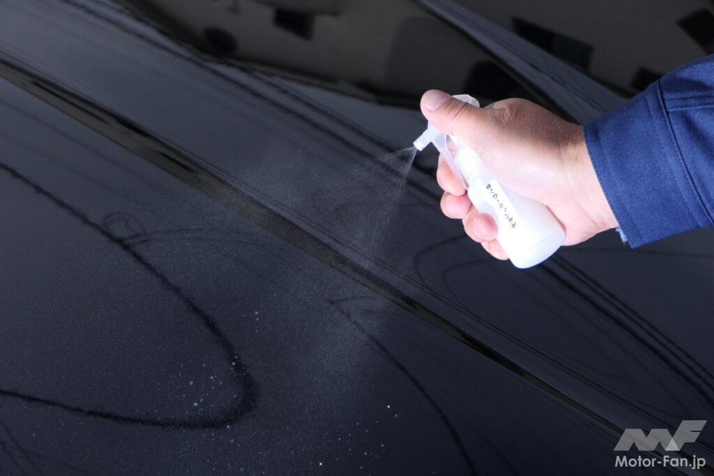 このコーティング剤は希釈せずに使用するタイプ。液剤はスプレーボトルに小分けするのがオススメだ。ボディに直接吹きかけてもいいが、濃色車はクロスに吹きつけてから塗り込んだほうがいい。