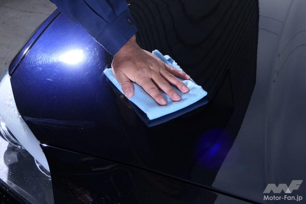 クルマを洗い終わったら、液剤が乾燥する前に水でしっかりと洗い流して、ボディに付着した水滴をマイクロファイバークロスで拭き上げれば、コーティング前の下地処理は完了だ。