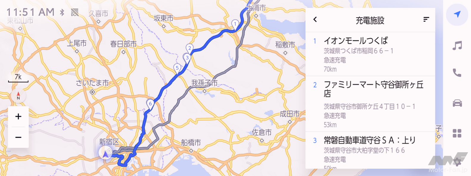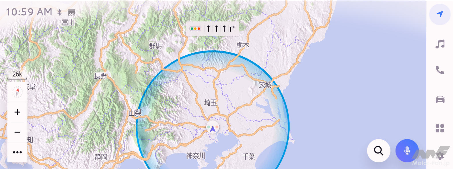 クラウド上の地図情報を活用し、交通情報や駐車場の空き情報をリアルタイムで取得するコネクティッドナビ。通常のナビゲーション機能に加え、目的地設定時にバッテリー残量に基づき目的地に到着出来ないと判断された場合、ルート沿いの充電施設をあらかじめ中継地点として提案する「移動支援」機能、航続可能エリアの円形表示、バッテリーが少なくなると周辺の充電施設を提案する充電施設検索など、BEVならではの機能にも対応している。