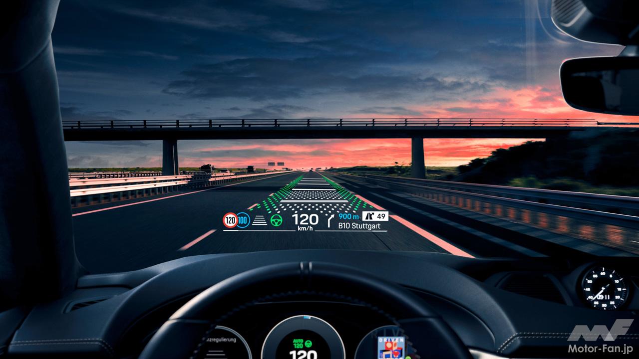 ポルシェドライバーエクスペリエンスには初めて、AR(拡張現実)技術によるヘッドアップディスプレイも装備されている。ナビゲーションの矢印などの仮想エレメントは、視覚的にシームレスに現実世界に統合され、87インチディスプレイのサイズに相当する画像が、ドライバーの10m前方に表示される。