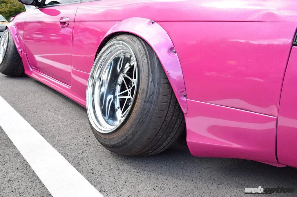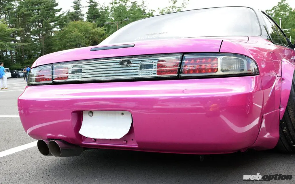ちなみに、マシンメイクを担当したのは鈑金屋を営む旦那様で、このクルマ以上のネガキャンなS14シルビアを所有しているそう。オールペイントはお手の物とはいえ、この光の加減で表情を変えるメタリックピンクのボディカラーは、調色だけで30回以上作り直しさせて、さすがに怒られたというエピソードも…。(W-Option JAMBOREEより)